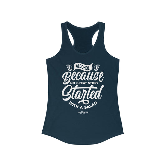 "Alcohol Because No Great Story Started with Salad" Women's Bartender Tank