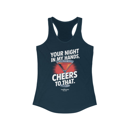 "your night in my hands cheers to that" Women's Bartender Tank Tops