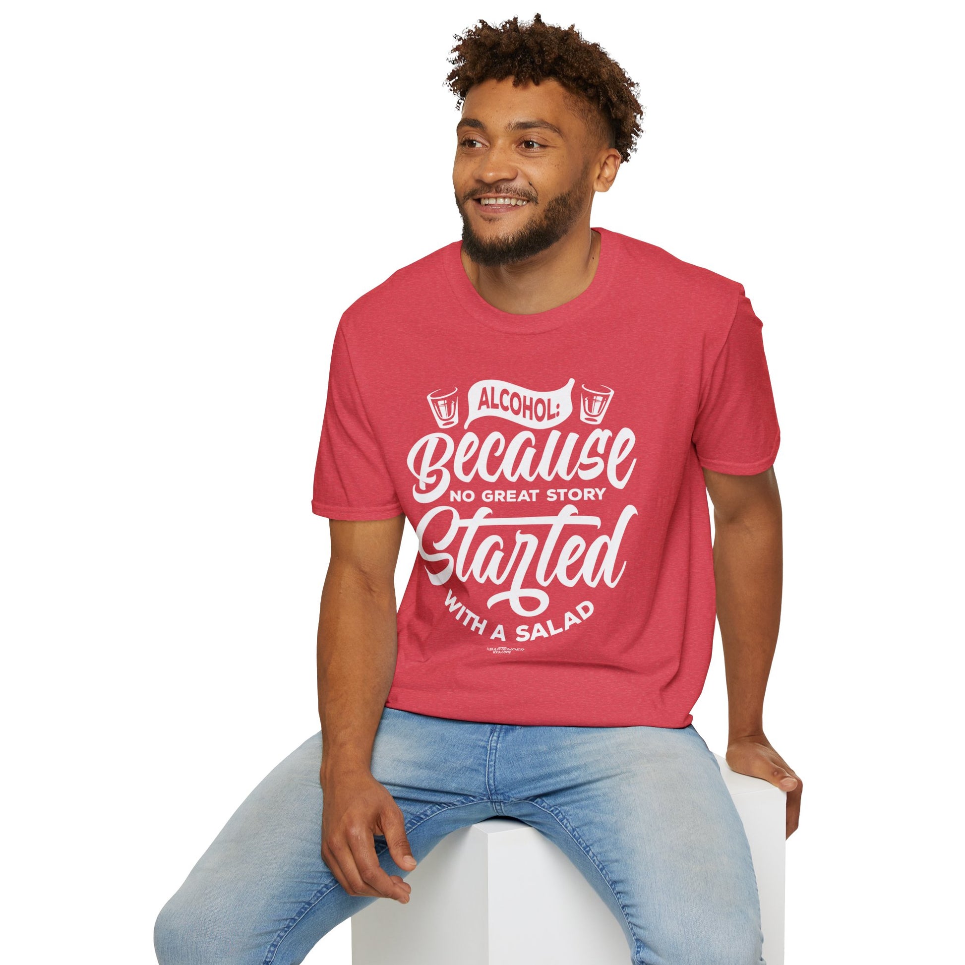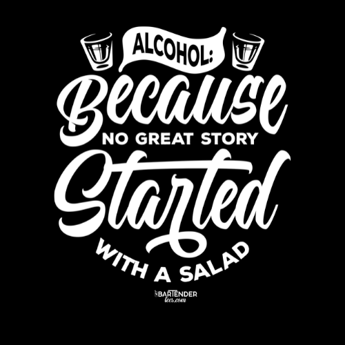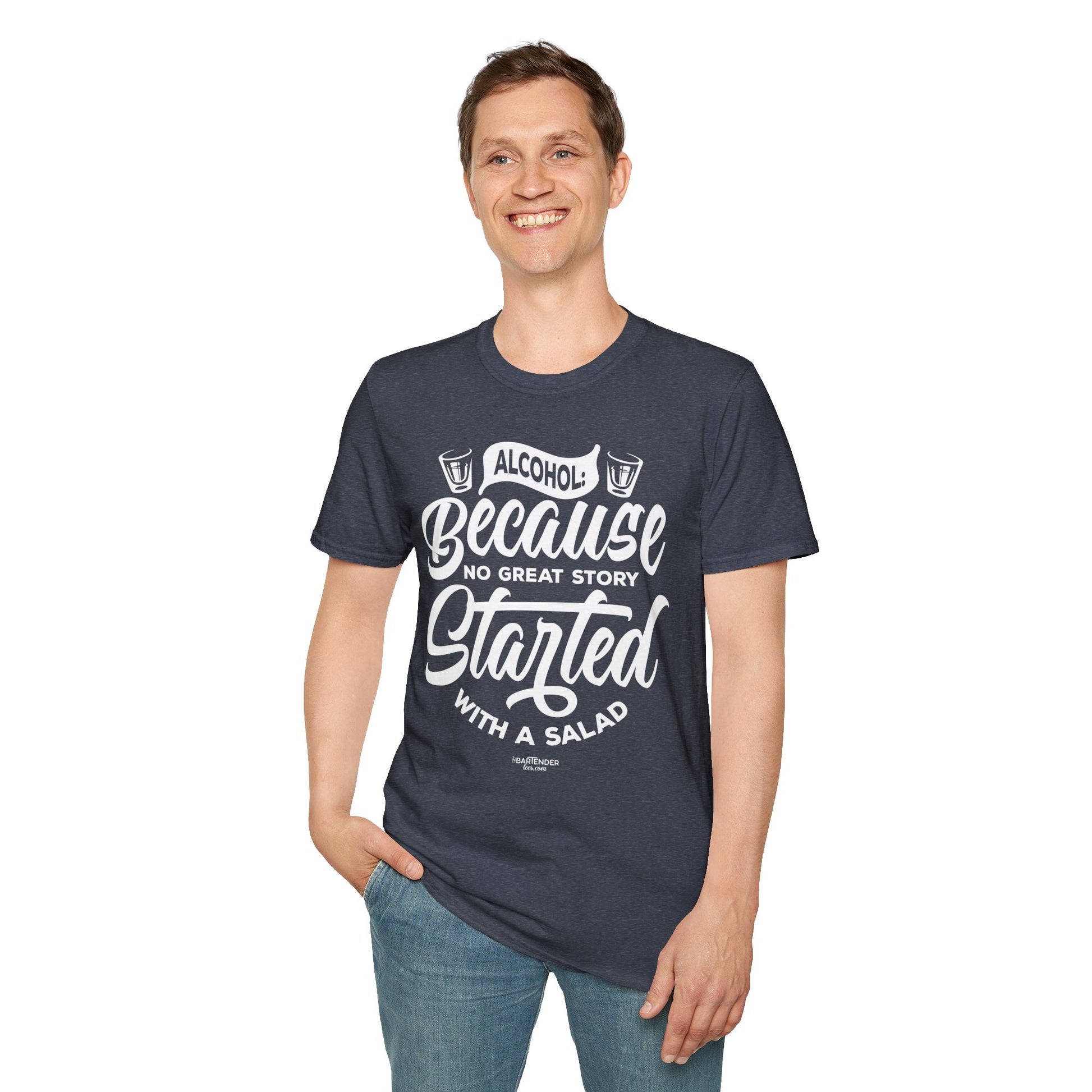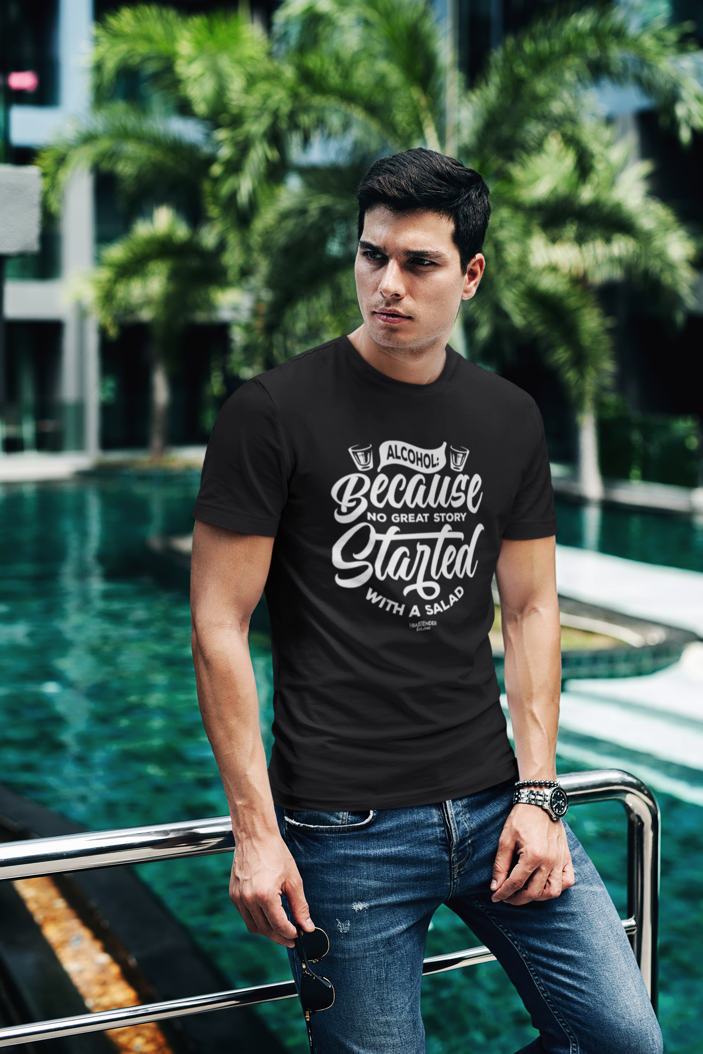 The best stories start with a drink, not a salad. Our 'Alcohol, Because No Great Story Started with Salad' tee is perfect for bartenders who mix great cocktails and keep the conversation flowing. Comfort and style, whether behind the bar or out on the town.