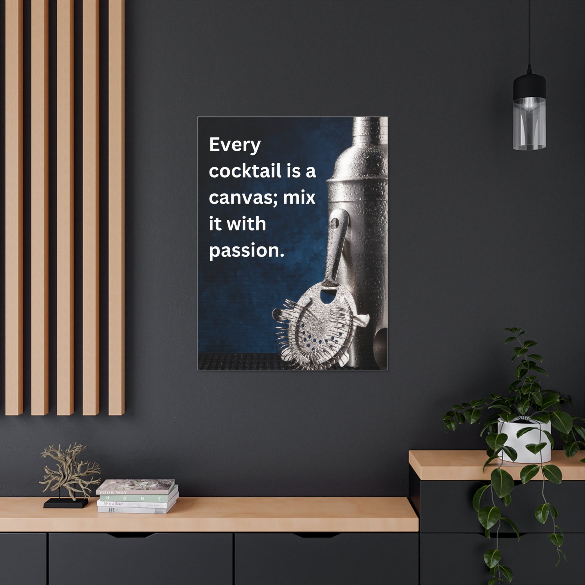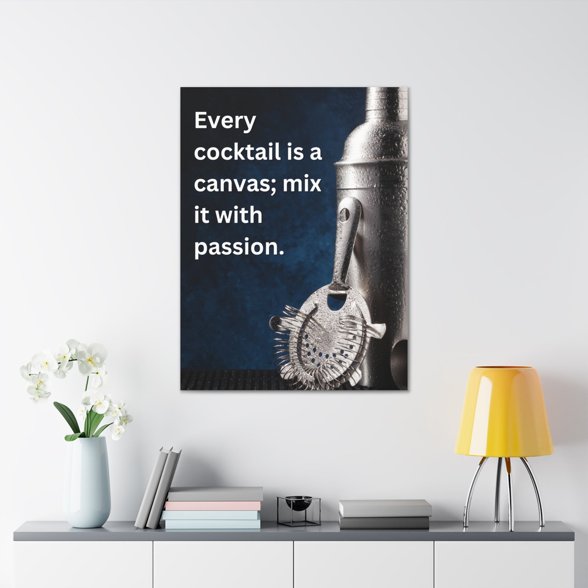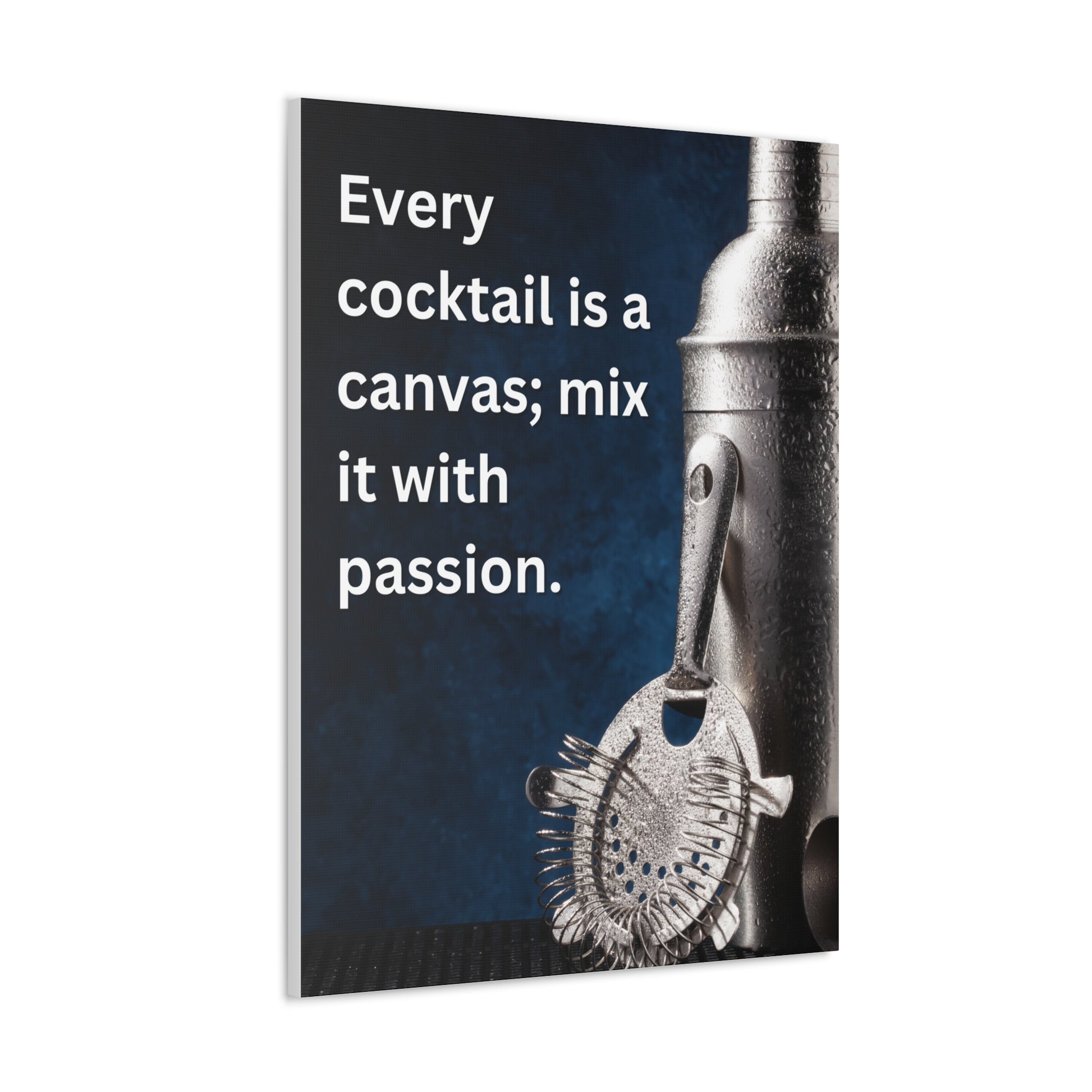 Transform your home bar or kitchen with our stunning 30" x 40" Canvas Art, featuring the inspiring quote, "Every cocktail is a canvas; mix it with passion." This captivating piece showcases a beautifully detailed image of a professional cocktail shaker and strainer, accented by a rich blue backdrop that evokes the essence of mixology.