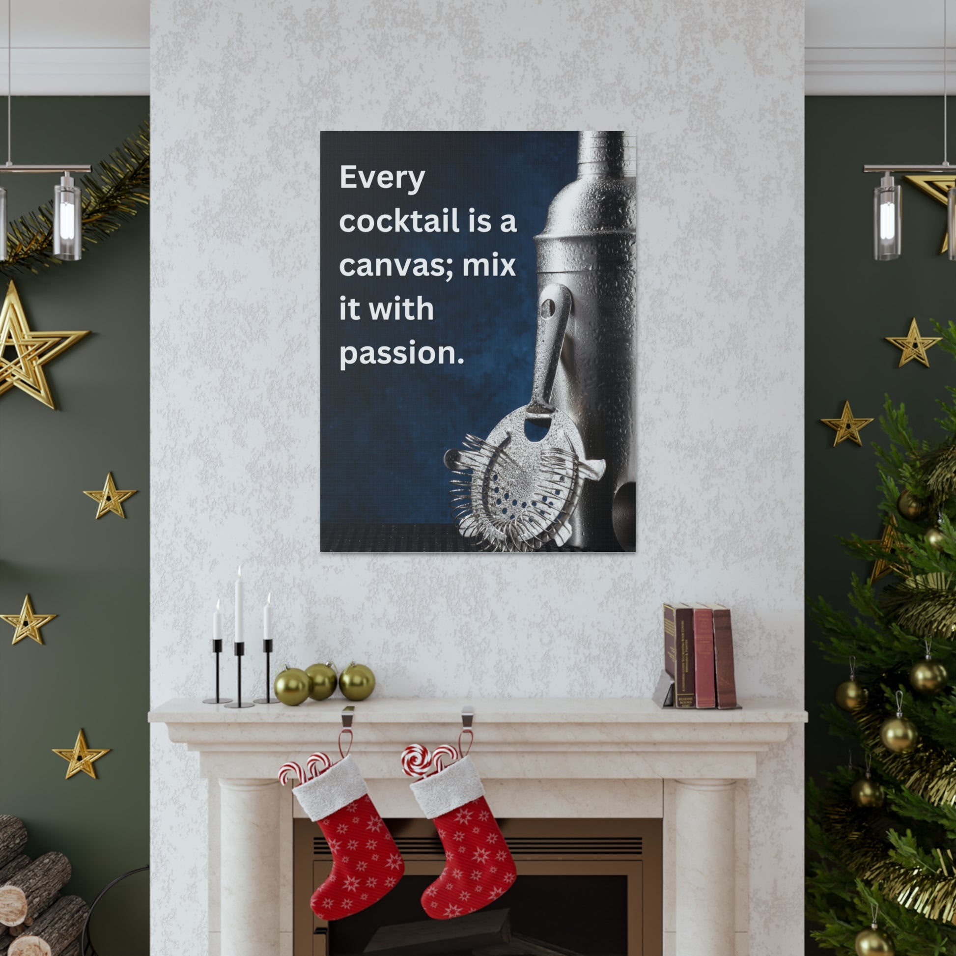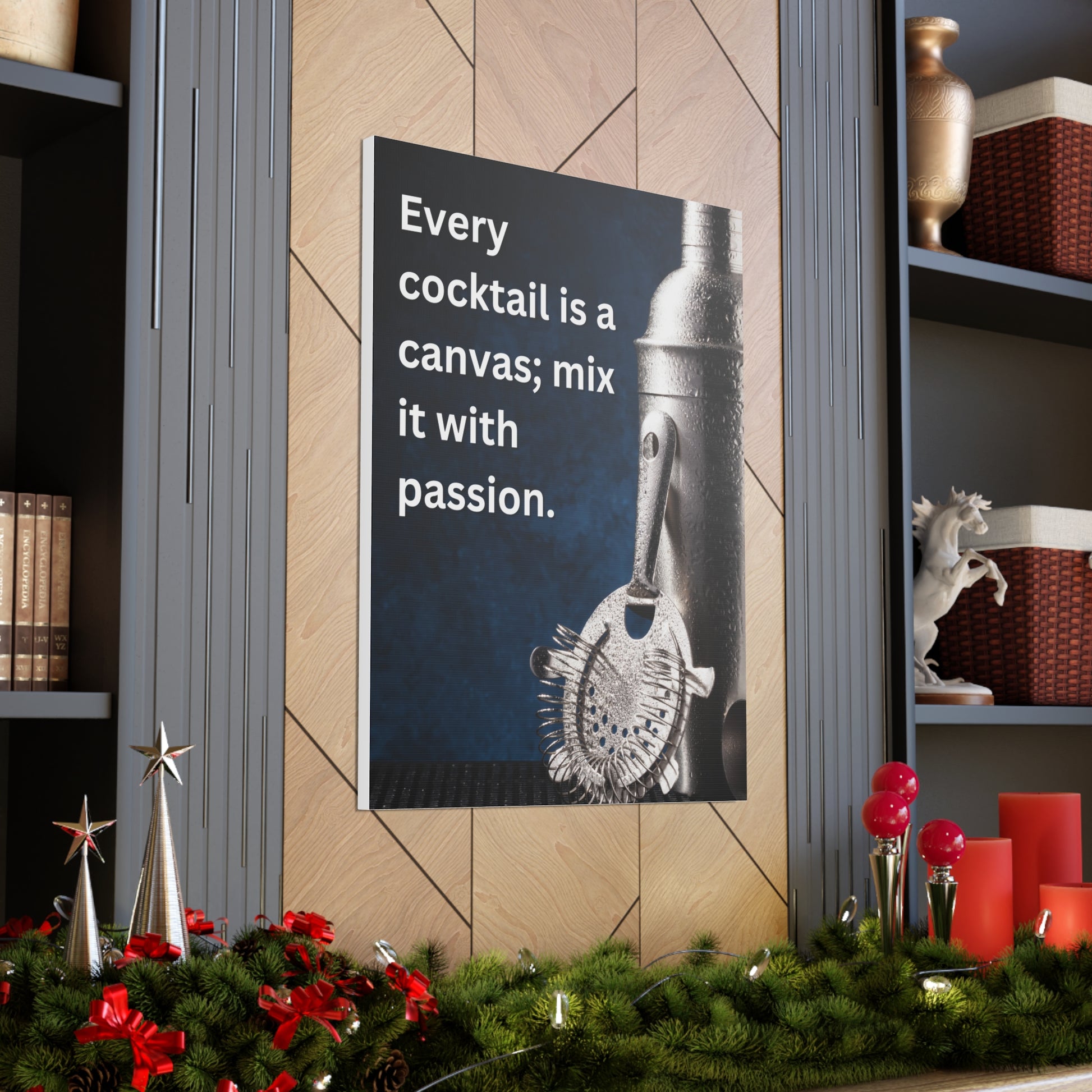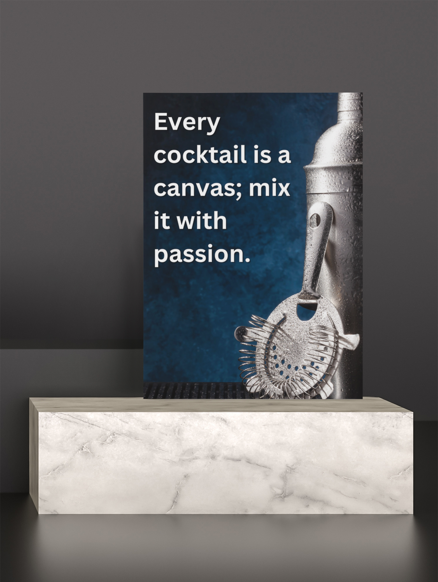 Transform your home bar or kitchen with our stunning 30" x 40" Canvas Art, featuring the inspiring quote, "Every cocktail is a canvas; mix it with passion." This captivating piece showcases a beautifully detailed image of a professional cocktail shaker and strainer, accented by a rich blue backdrop that evokes the essence of mixology.