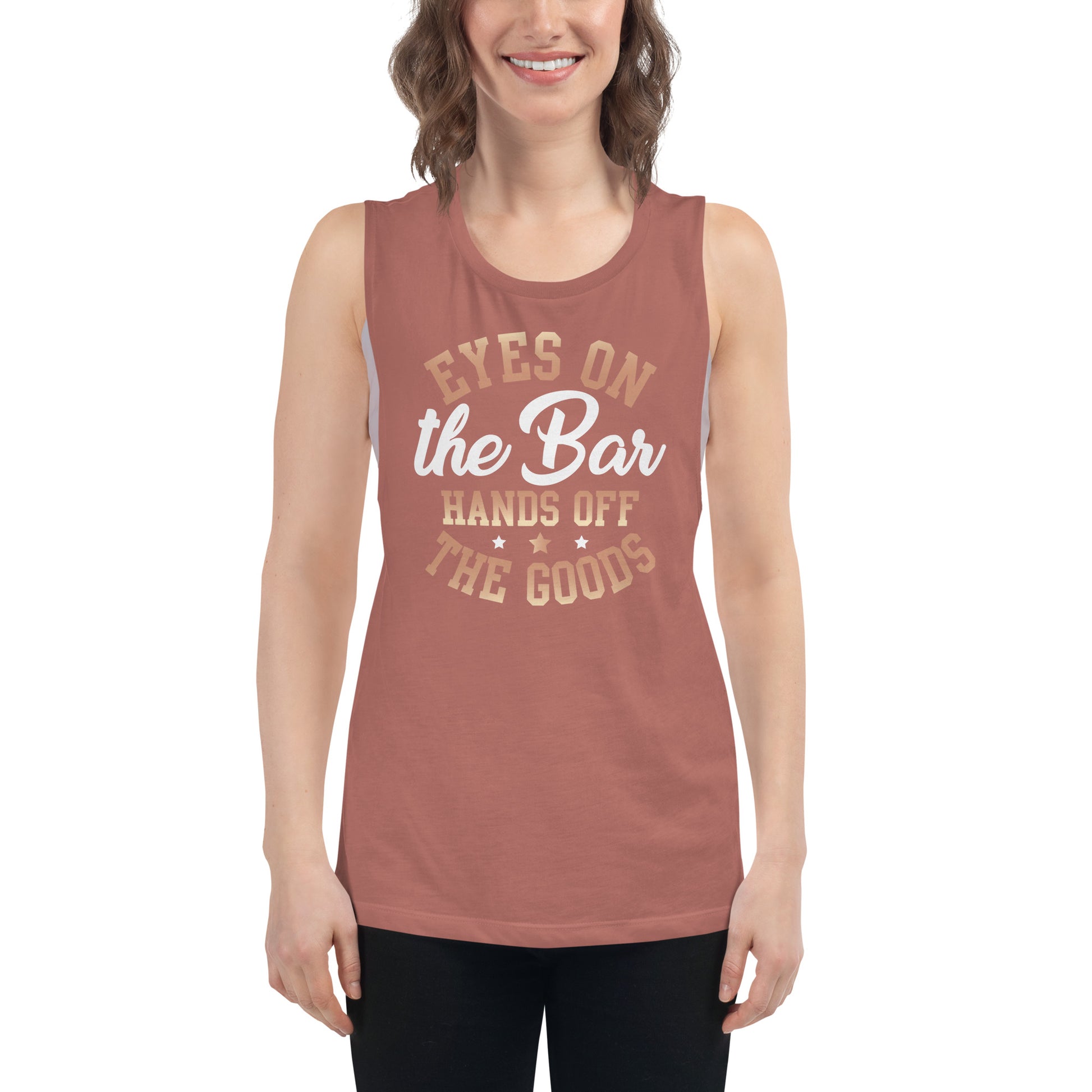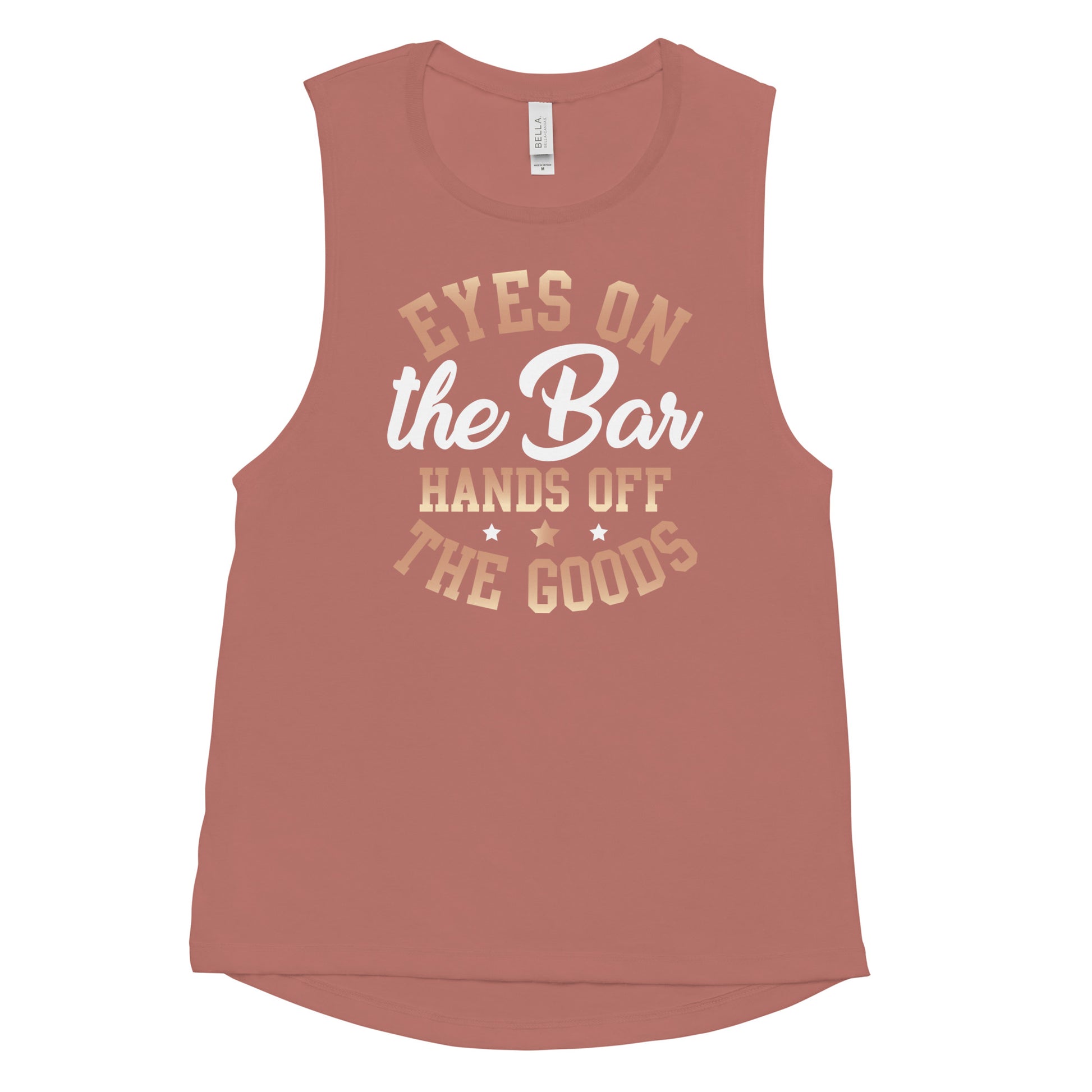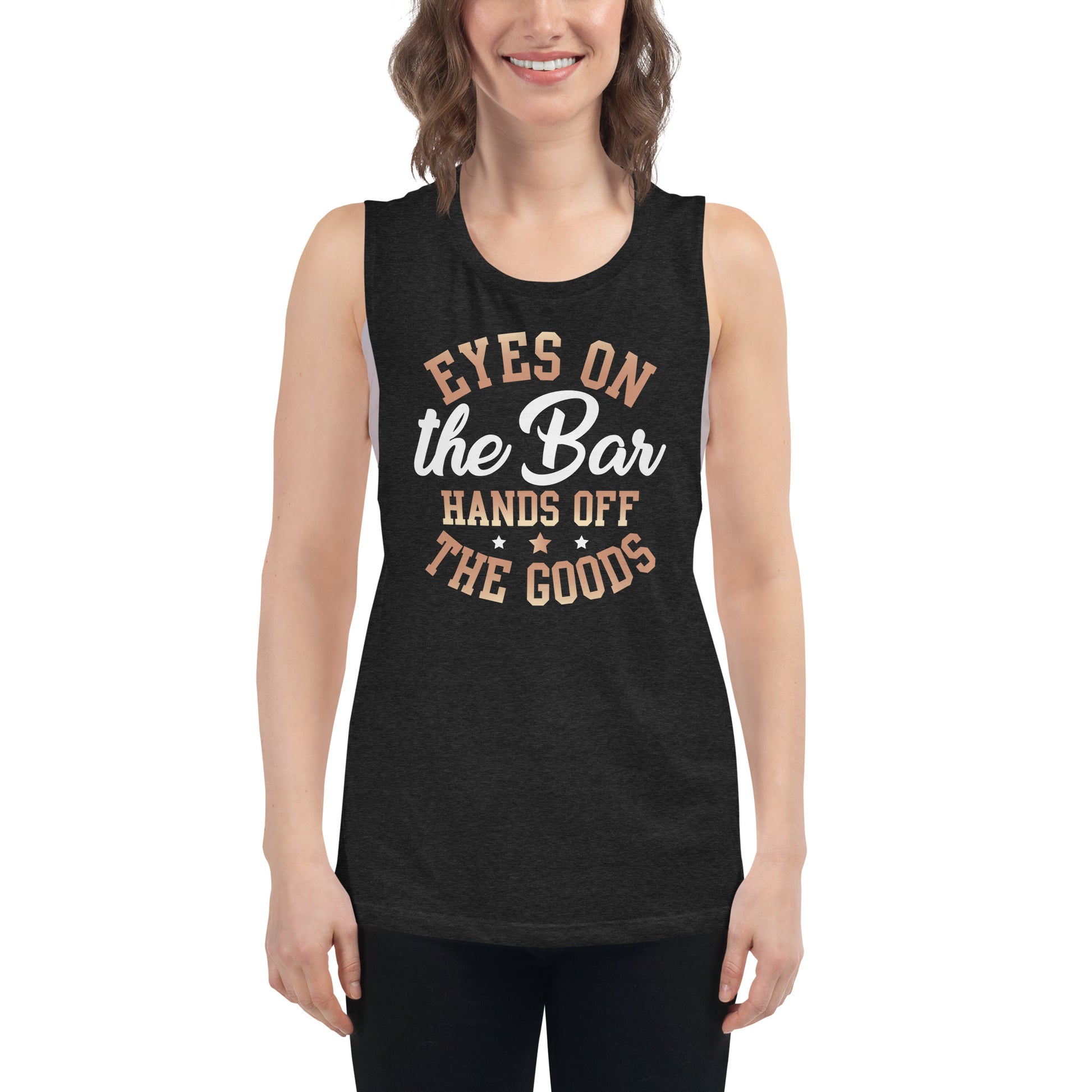 "Eyes On The Bar Hands Off The Goods" Women's Muscle Tank