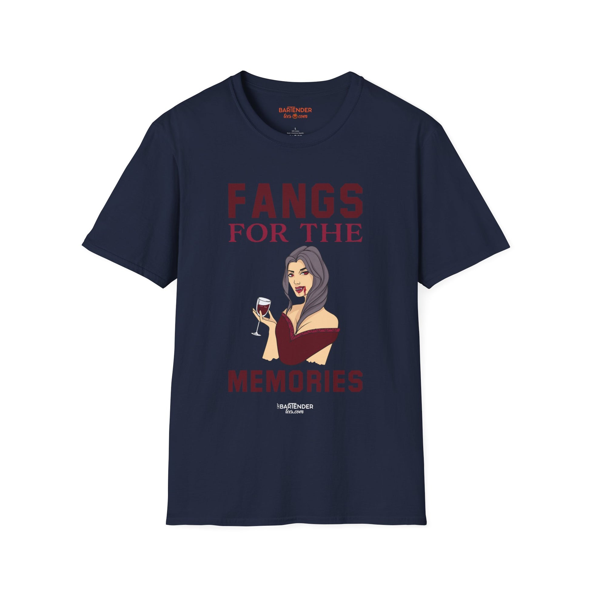 Perfect for Halloween, themed parties, or just showing off your love for bartending with a vampiric twist, the "Fangs for the Memories" tee is a unique and fun addition to your wardrobe. Embrace the night and let your personality shine—no fangs required!