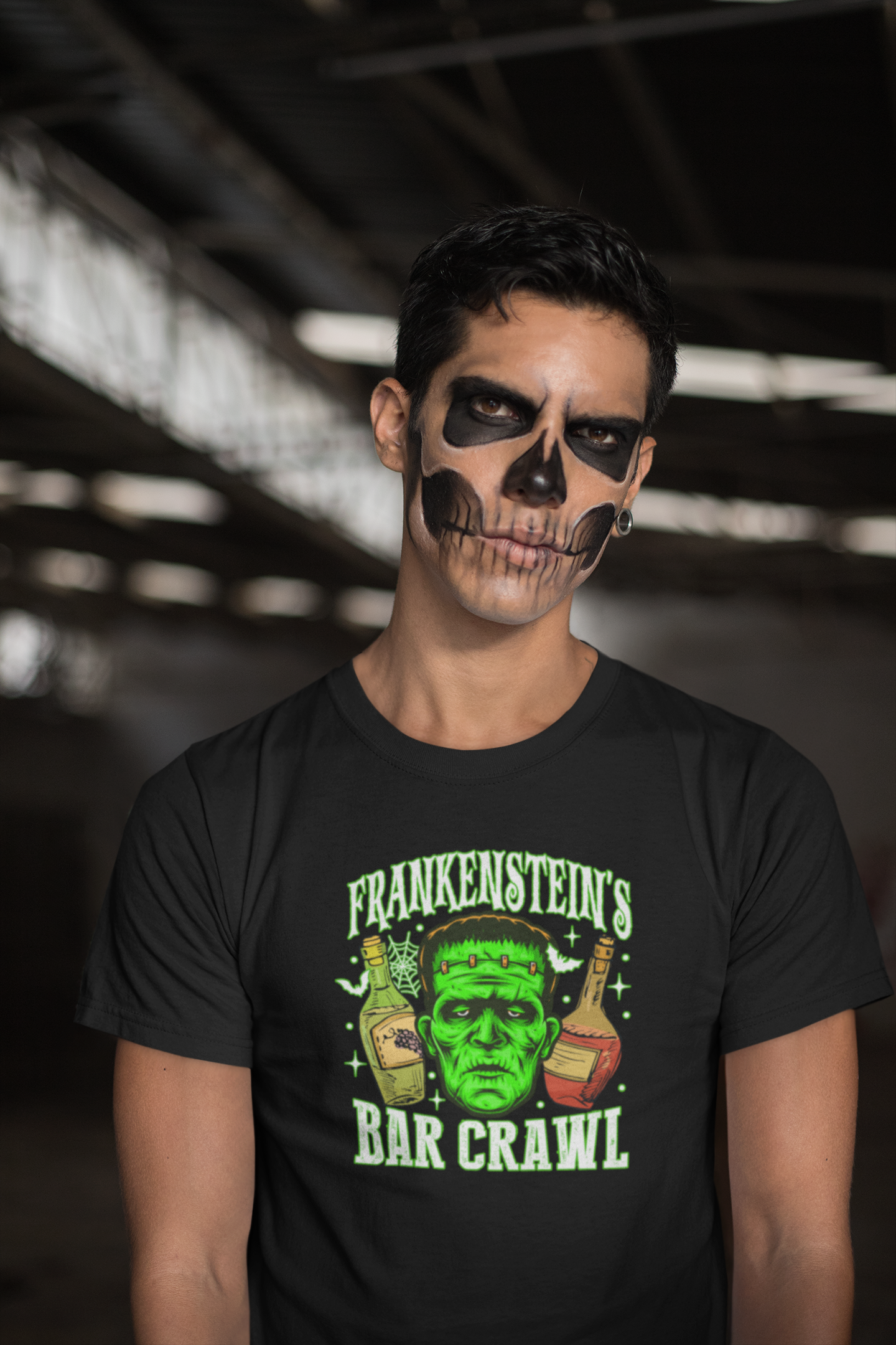 Crafted from soft, high-quality fabric, this shirt ensures comfort whether you're hitting the town for a bar crawl or enjoying a haunted gathering with friends. The striking phrase "Frankenstein's Bar Crawl" adds a humorous twist, making it a great conversation starter.