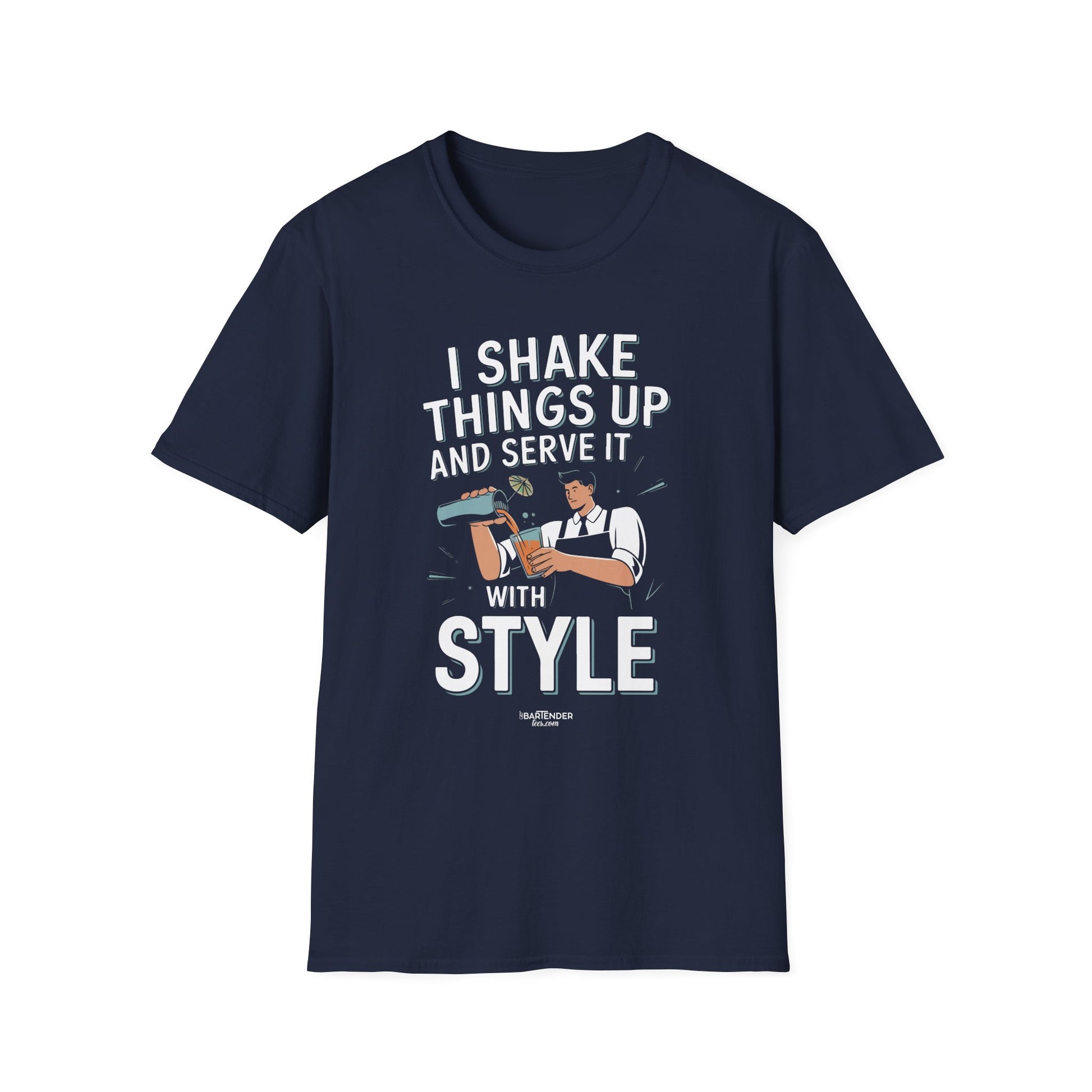 Shake things up with this dynamic bartender tee! Featuring a bold cocktail shaker and the statement "I Shake Things Up and Serve It with Style" this shirt is perfect for bartenders who know how to keep the drinks flowing and the energy high. Whether you're behind the bar or out with friends, this tee shows your pride in your skills and love for the craft. Ideal for bartenders, mixologists, and cocktail enthusiasts alike!