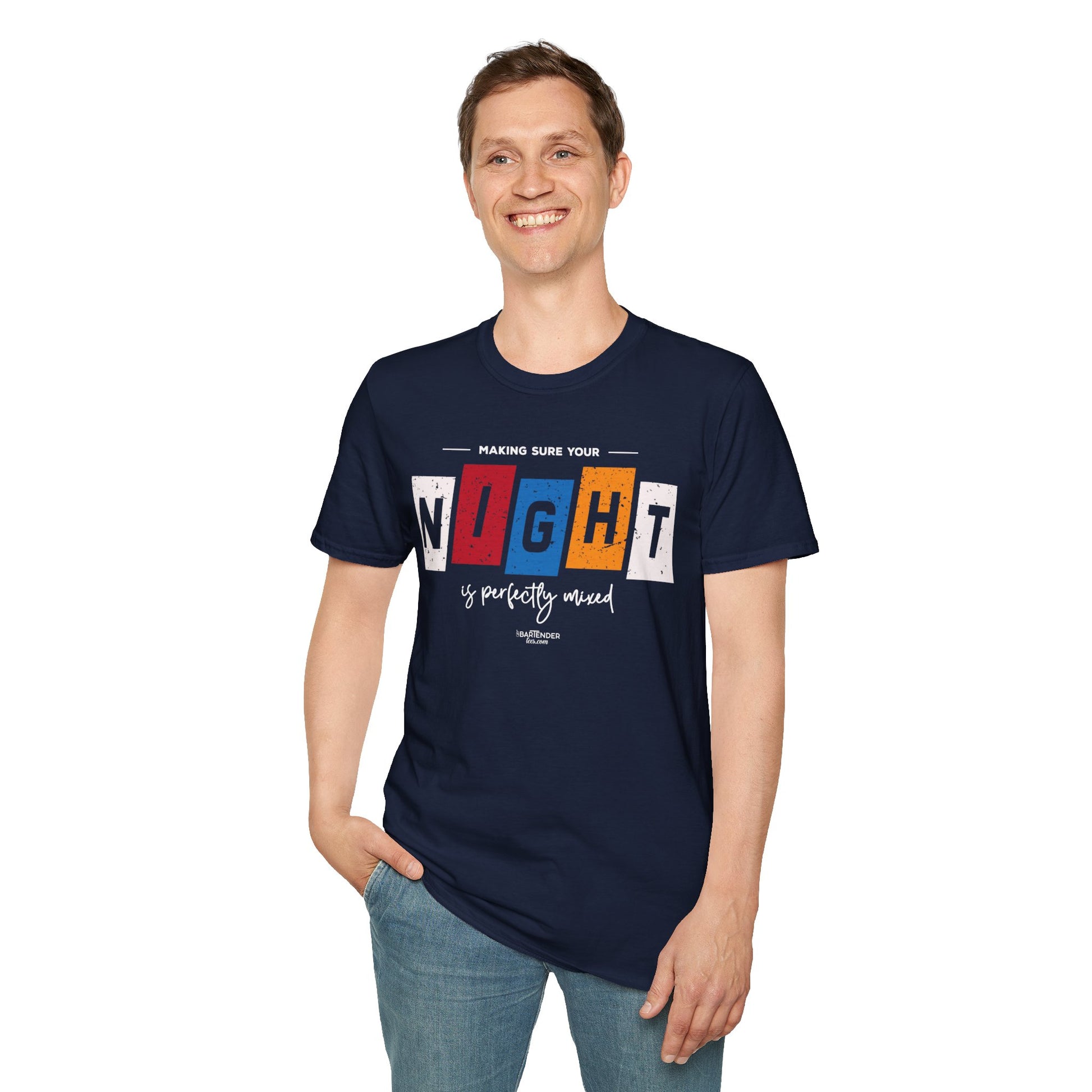 Ensure your night is as perfectly mixed as your favorite cocktail with this stylish and modern design. The bold, vibrant colors and distressed block lettering make a statement for bartenders and drink enthusiasts alike. Whether you’re the one behind the bar or just appreciating a well-made drink, this shirt is the perfect way to celebrate your passion for mixology. "Making sure your night is perfectly mixed" is more than just a phrase—it's a lifestyle.