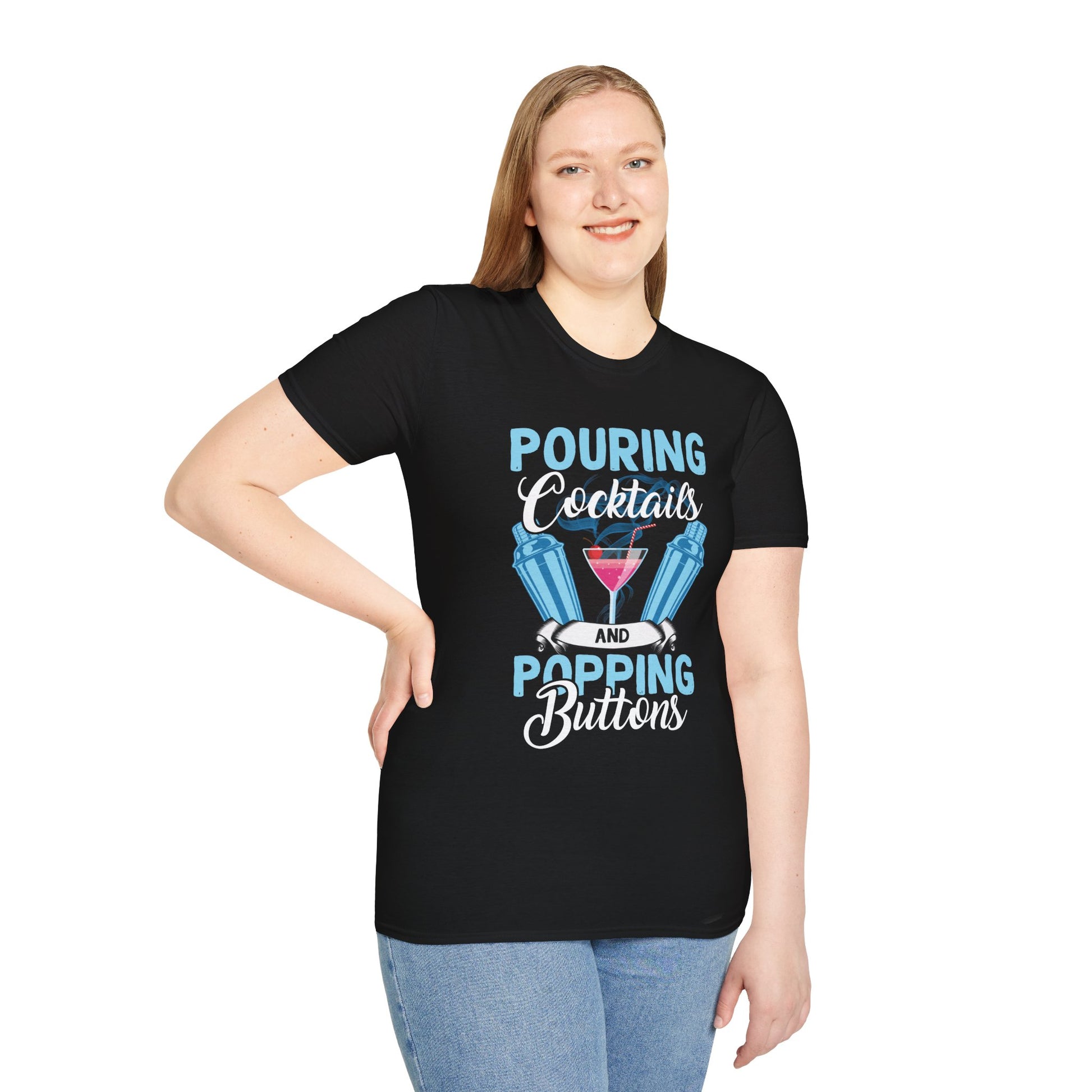 For the confident and curvaceous female bartenders, this "Pouring Cocktails and Popping Buttons" t-shirt is made to celebrate your fun and flirty attitude. Show off your skills behind the bar while embracing the fact that sometimes, you can't keep those buttons from popping! Perfect for bold bartenders who know how to mix drinks and turn heads. Whether you’re working a busy night or just owning your confidence, this shirt is sure to make a statement