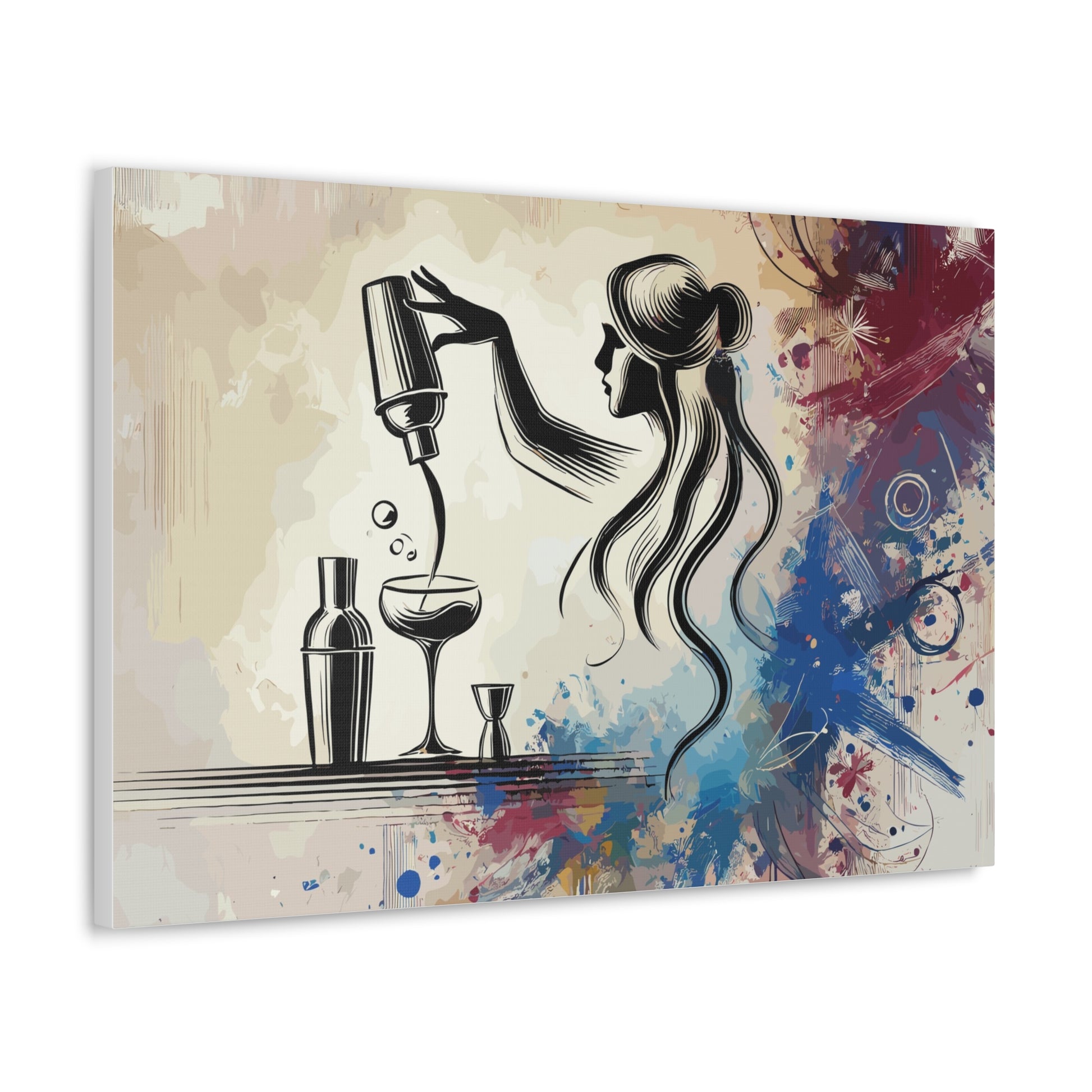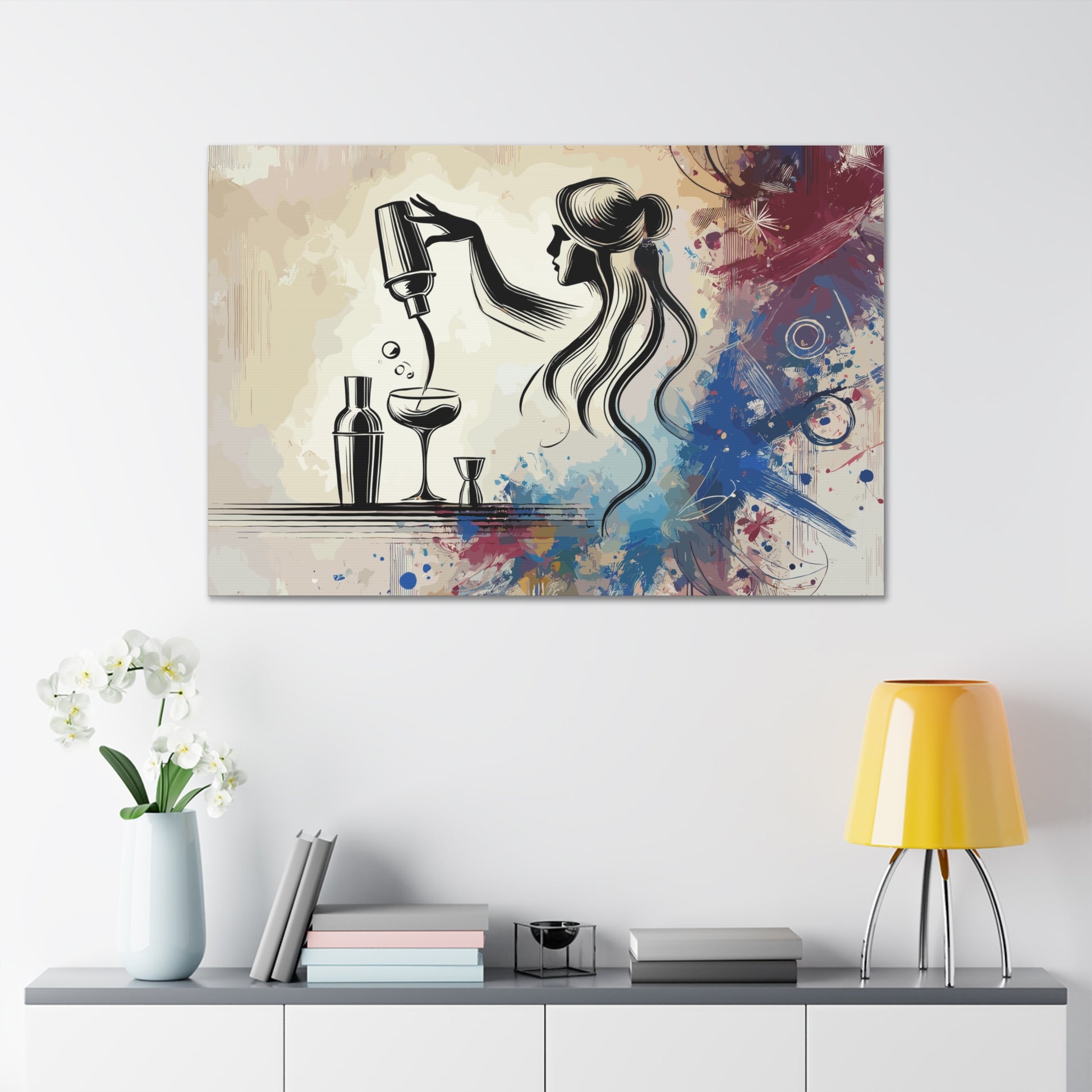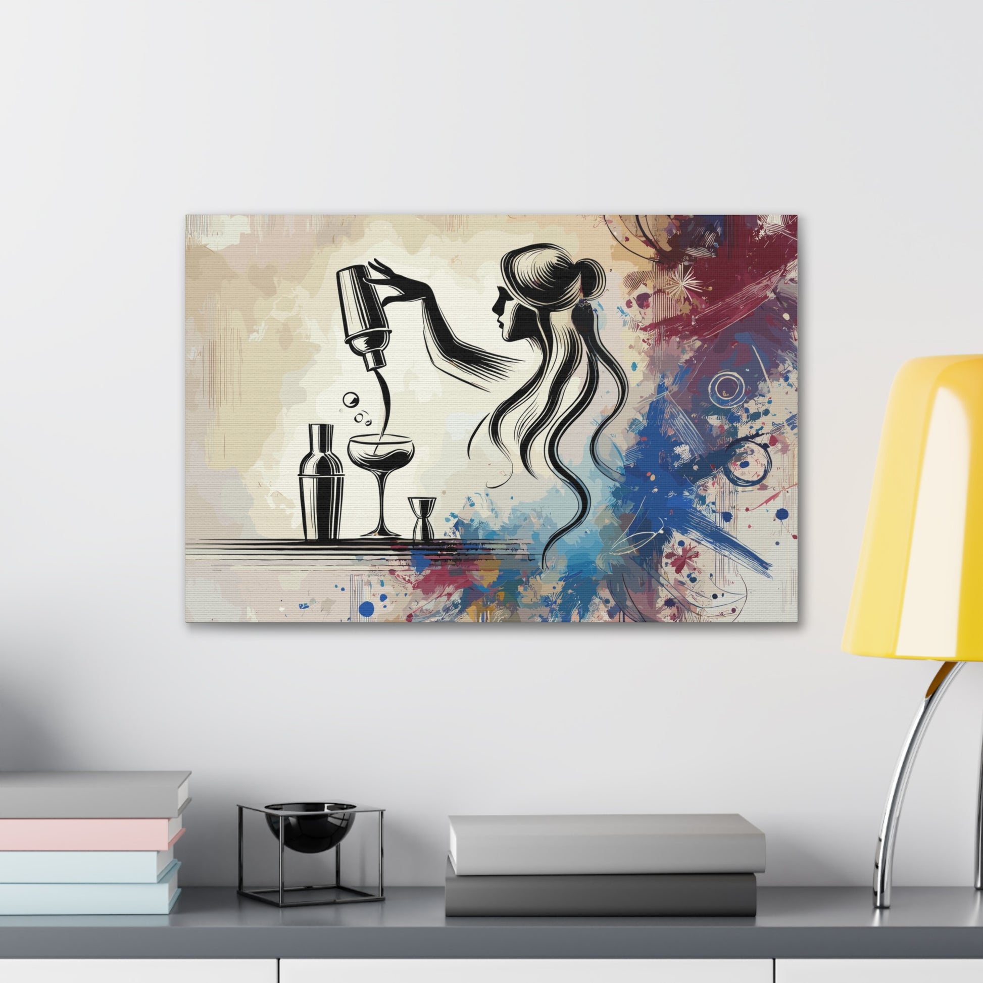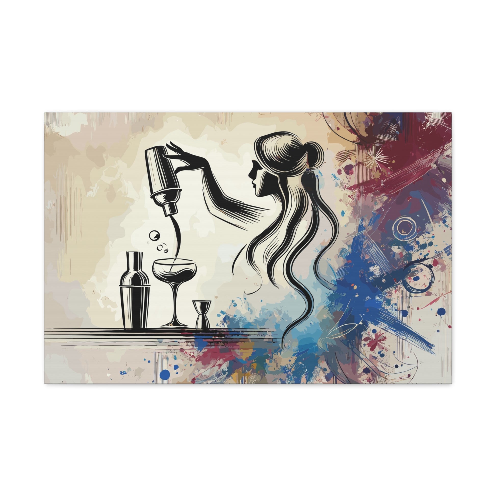 Available in three sizes—24" x 16", 30" x 20", and 48" x 32"—this canvas art is perfect for any space, whether you're looking to make a bold statement or simply add a touch of elegance to your decor. The design features a graceful bartender in action, expertly blending classic techniques with a modern aesthetic. The combination of black line art and a colorful background creates a dynamic visual that is sure to inspire any cocktail enthusiast.