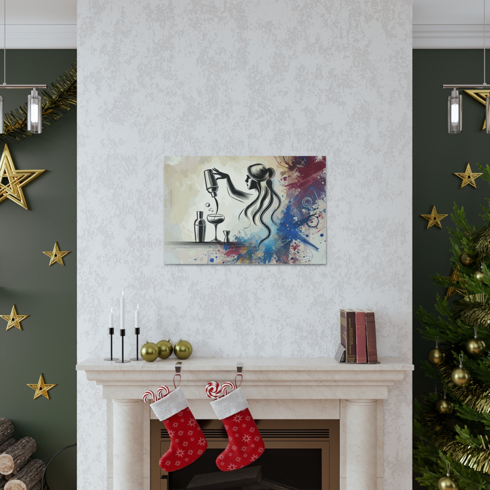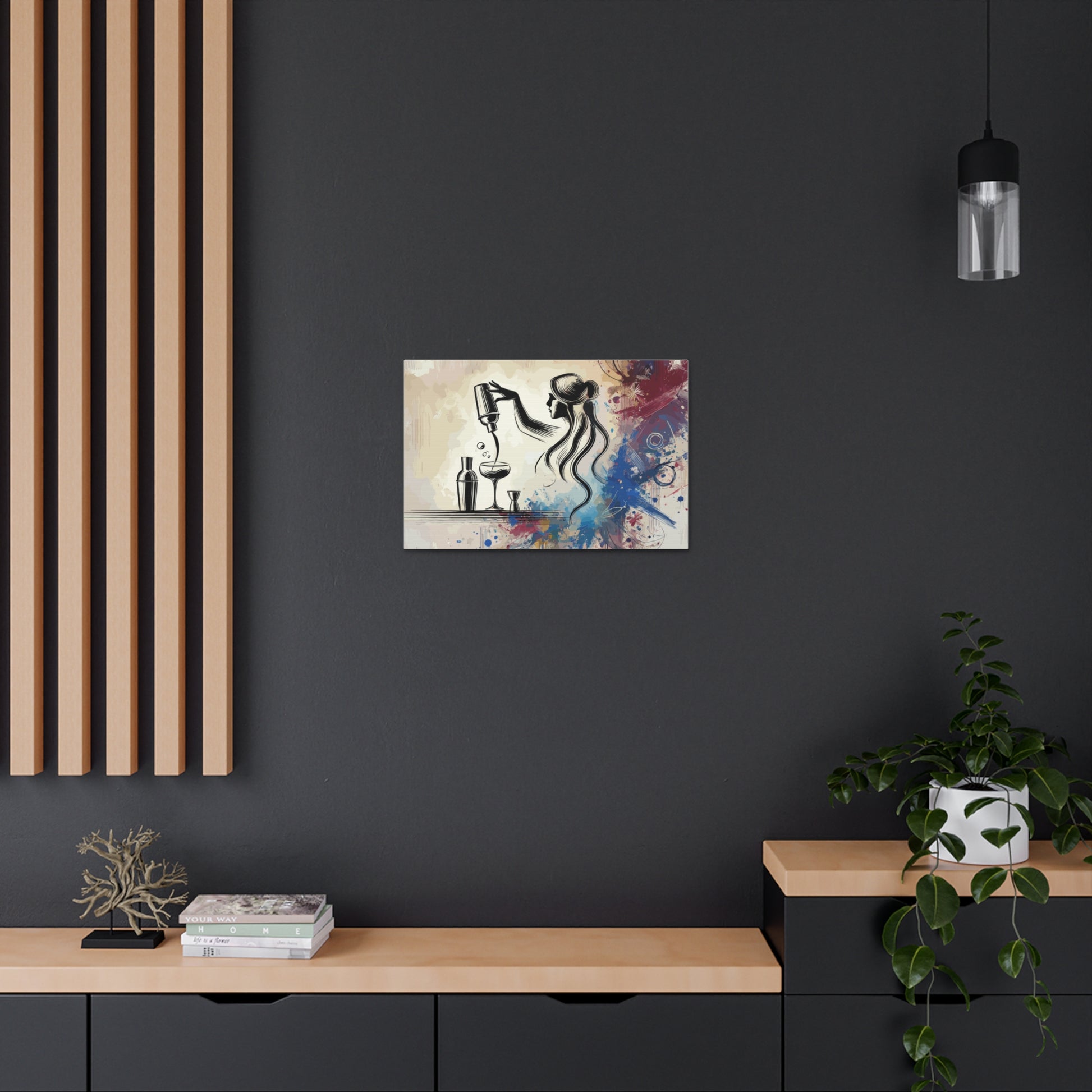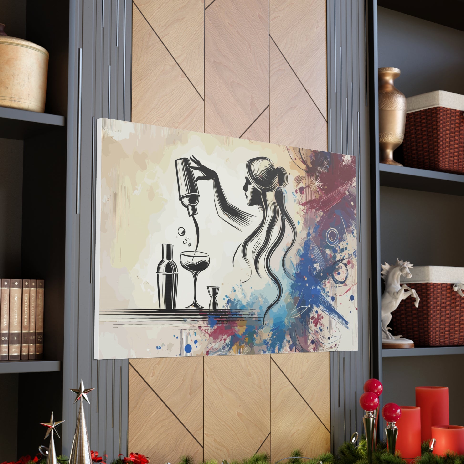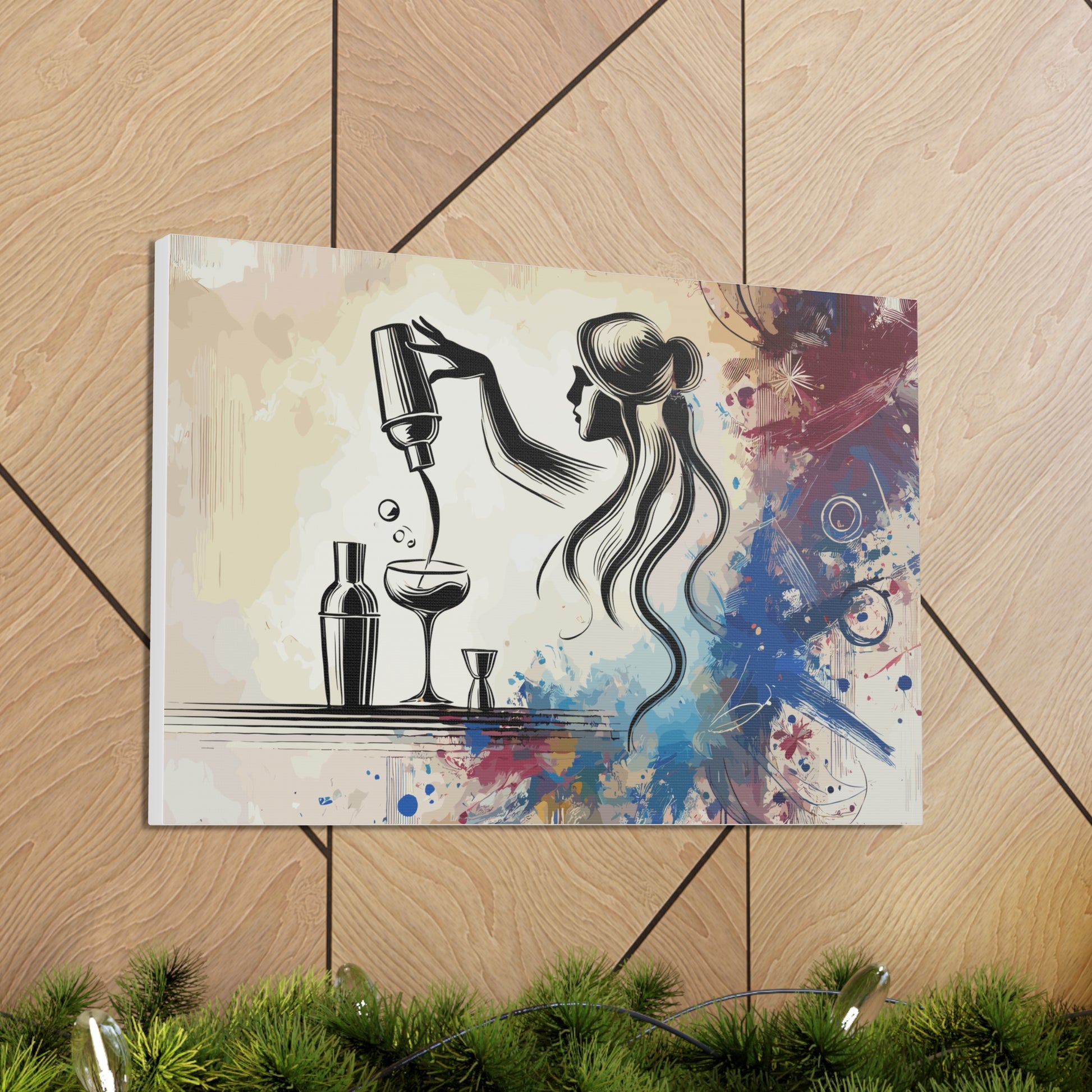 Available in three sizes—24" x 16", 30" x 20", and 48" x 32"—this canvas art is perfect for any space, whether you're looking to make a bold statement or simply add a touch of elegance to your decor. The design features a graceful bartender in action, expertly blending classic techniques with a modern aesthetic. The combination of black line art and a colorful background creates a dynamic visual that is sure to inspire any cocktail enthusiast.
