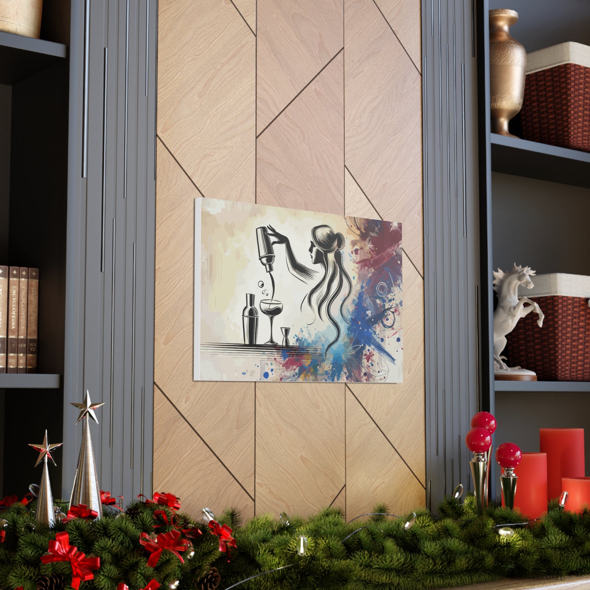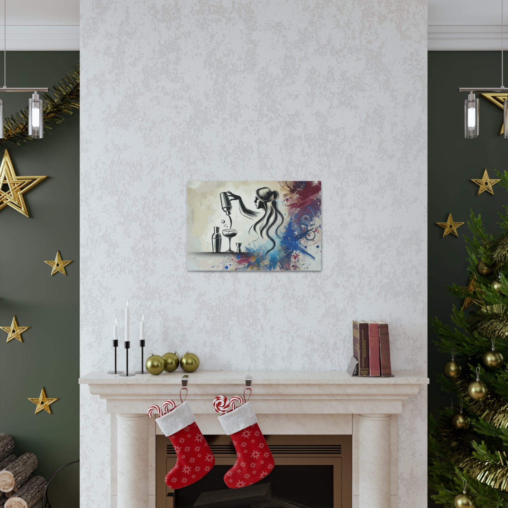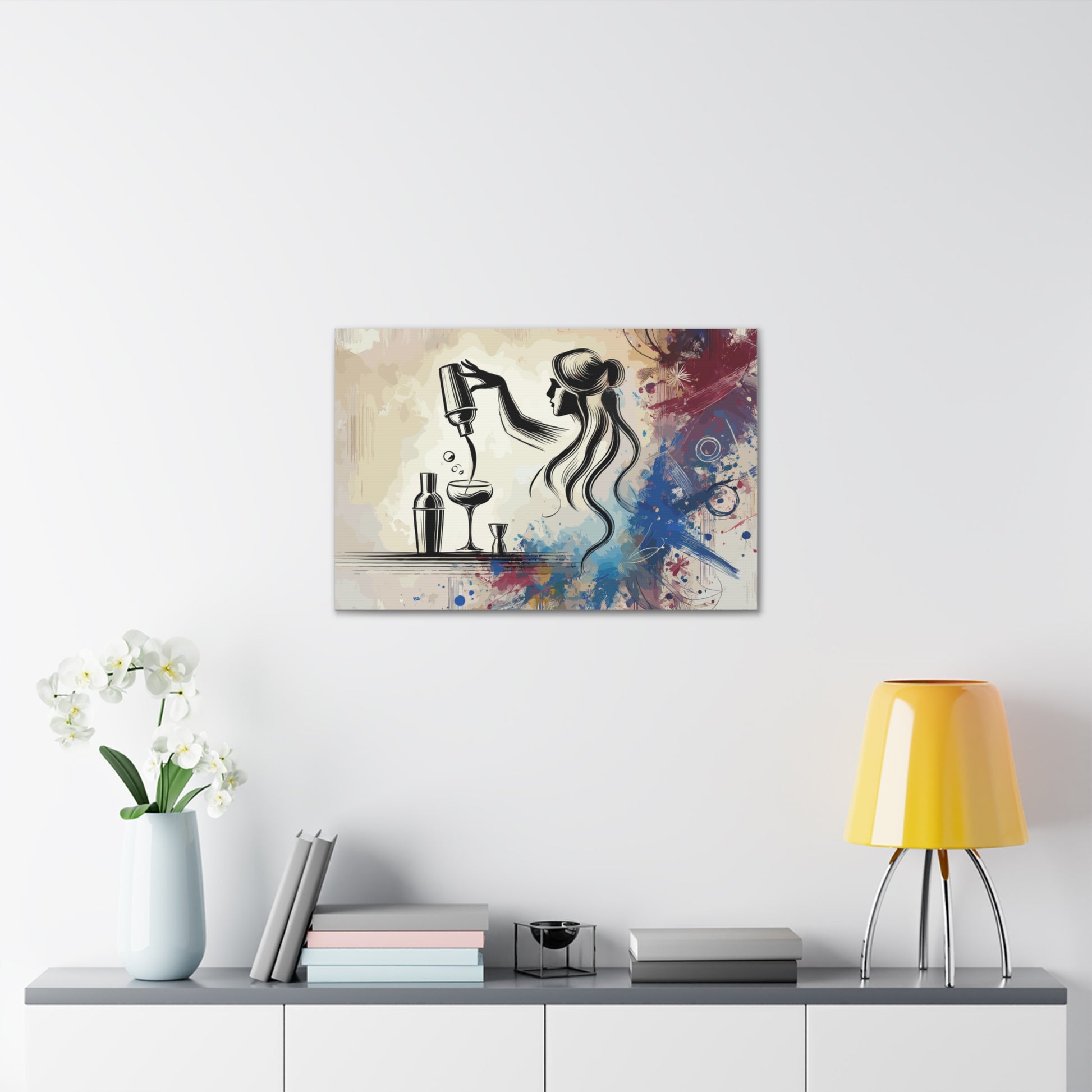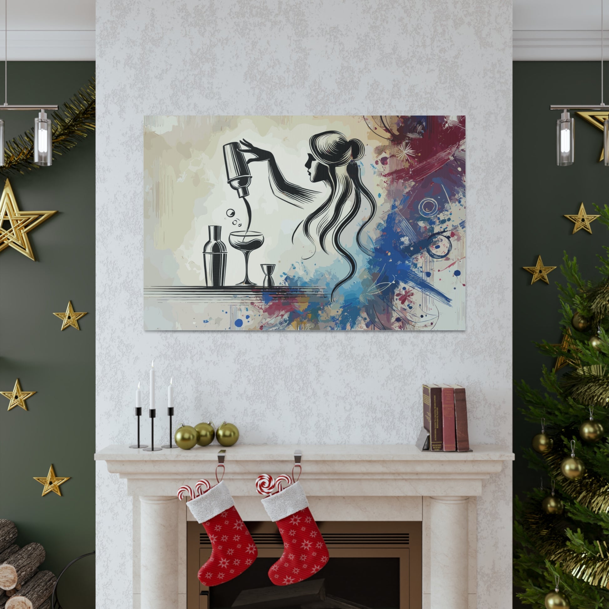 Available in three sizes—24" x 16", 30" x 20", and 48" x 32"—this canvas art is perfect for any space, whether you're looking to make a bold statement or simply add a touch of elegance to your decor. The design features a graceful bartender in action, expertly blending classic techniques with a modern aesthetic. The combination of black line art and a colorful background creates a dynamic visual that is sure to inspire any cocktail enthusiast.