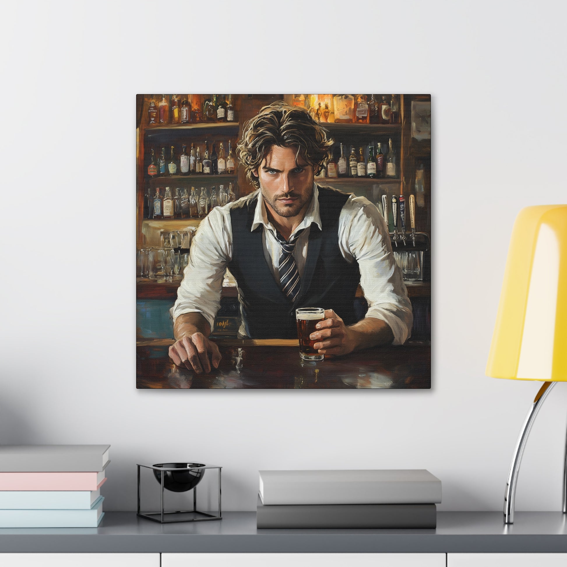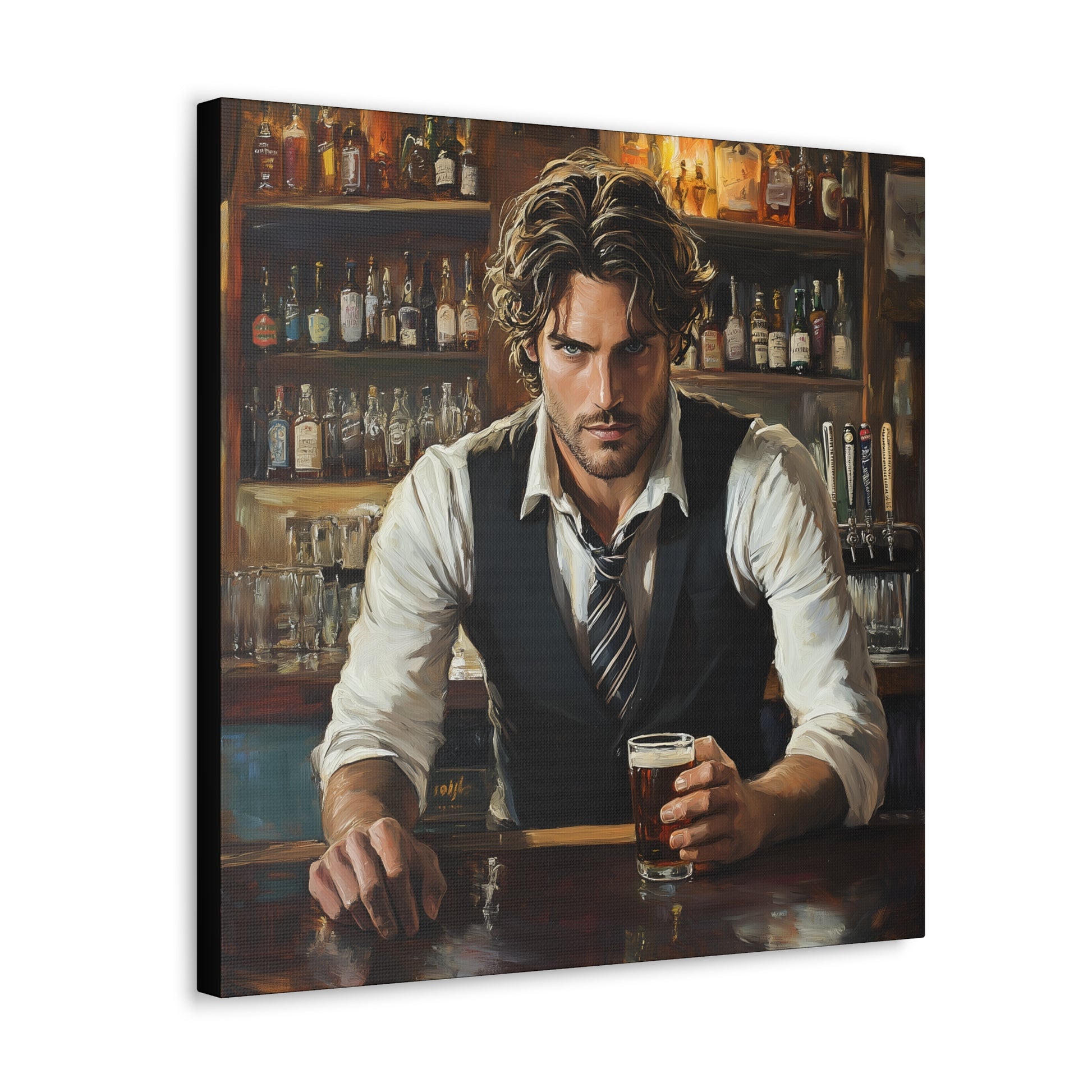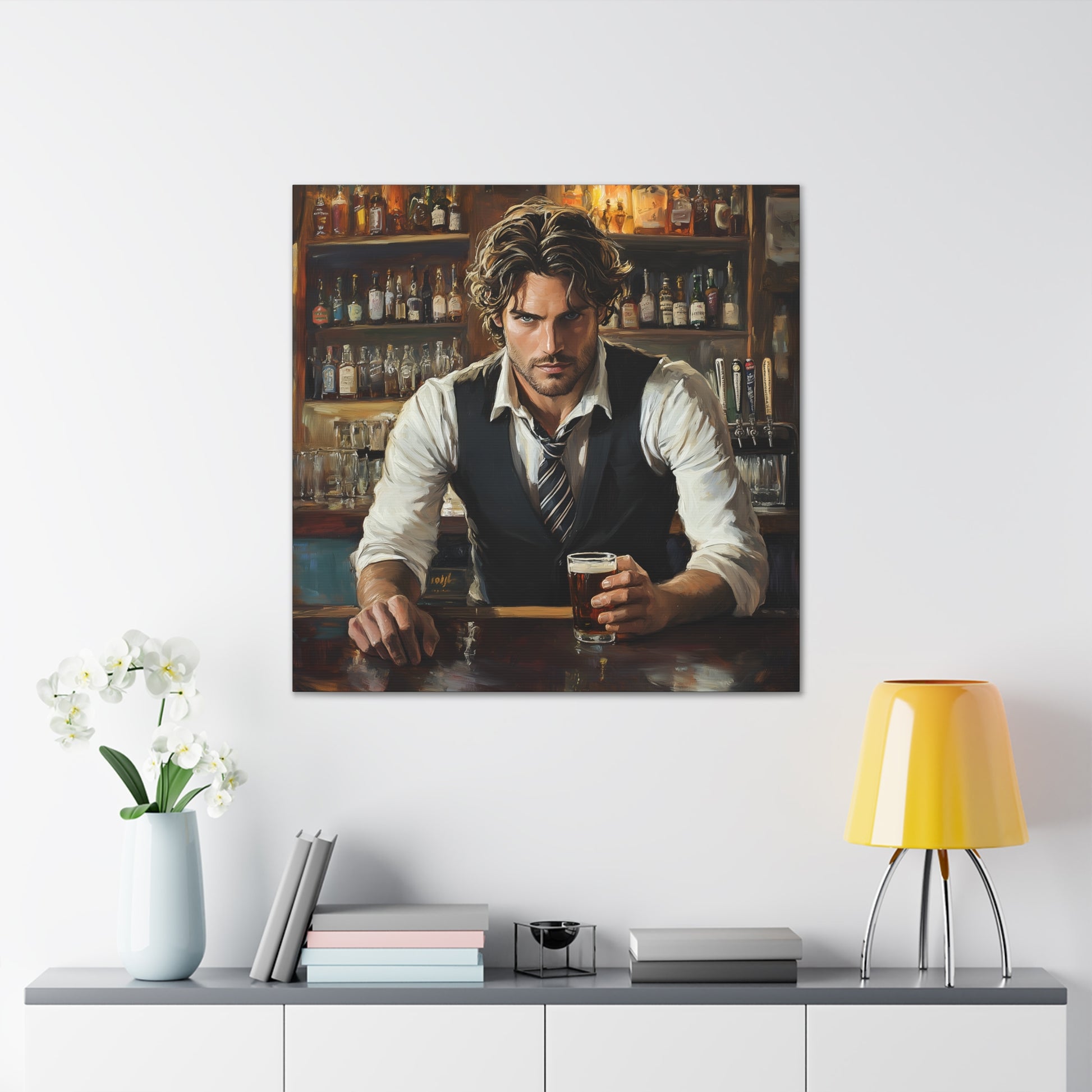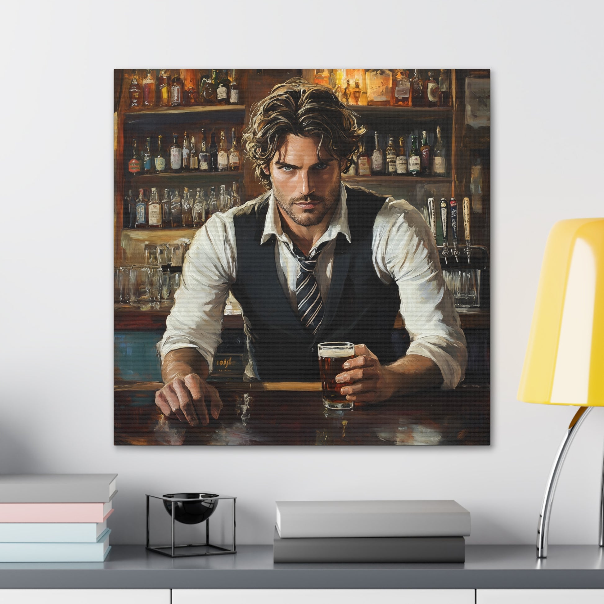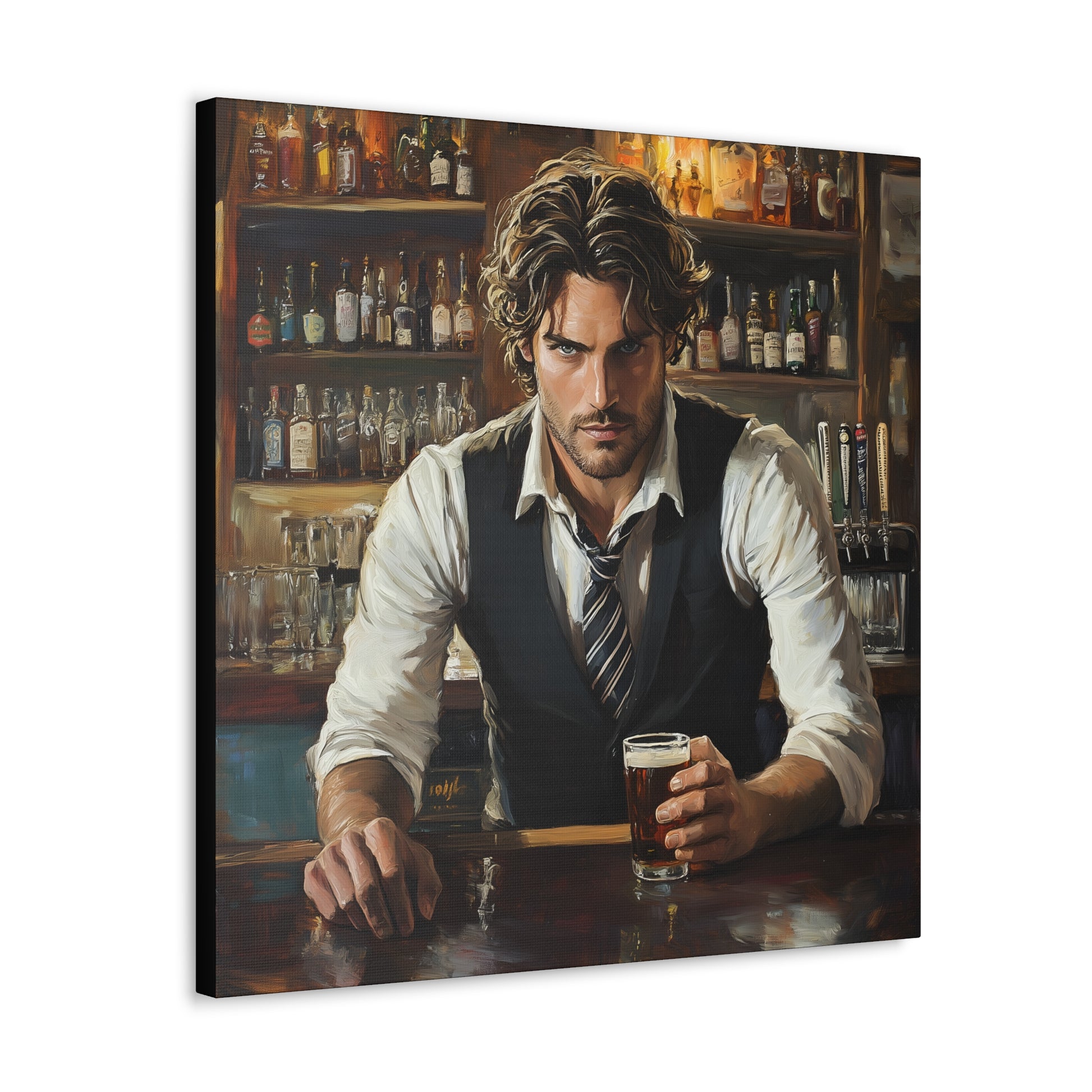 Introduce a captivating focal point to your space with our striking canvas art, "The Bartender's Gaze." This powerful piece features a ruggedly handsome bartender, exuding intensity and confidence as he holds a glass of beer. The detailed portrayal against the backdrop of a well-stocked bar captures the essence of nightlife and the artistry of mixology, making it a must-have for any bar, lounge, or home decor.