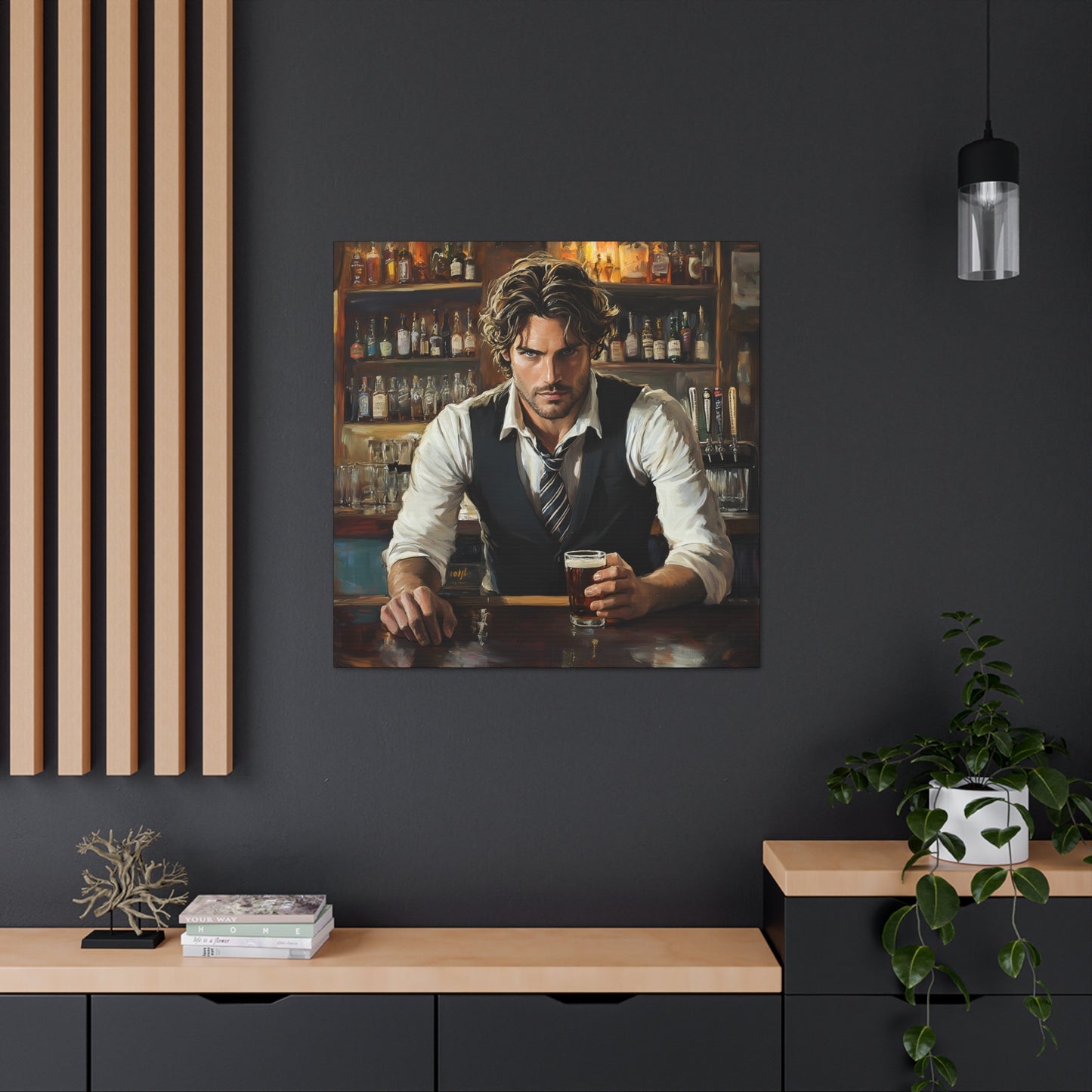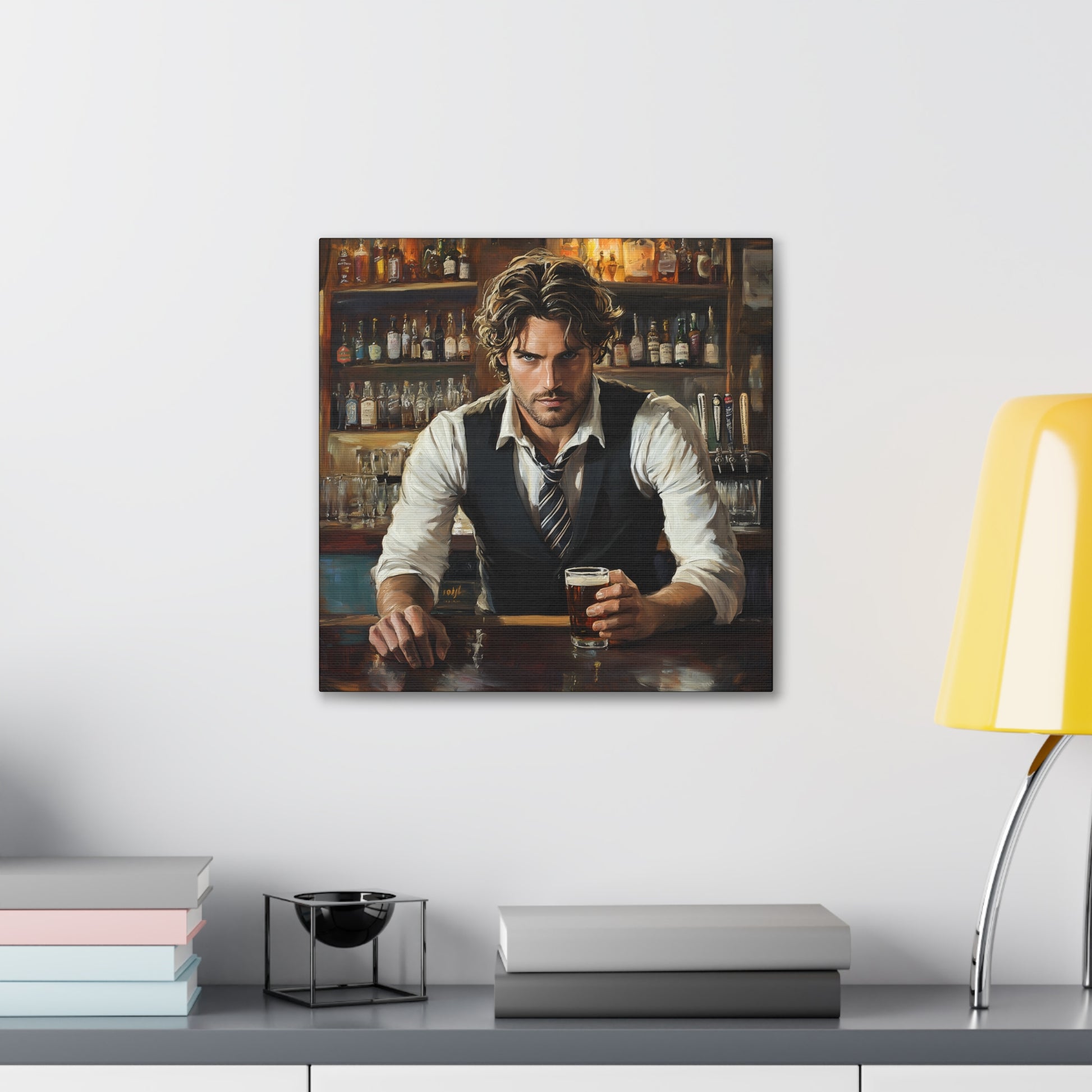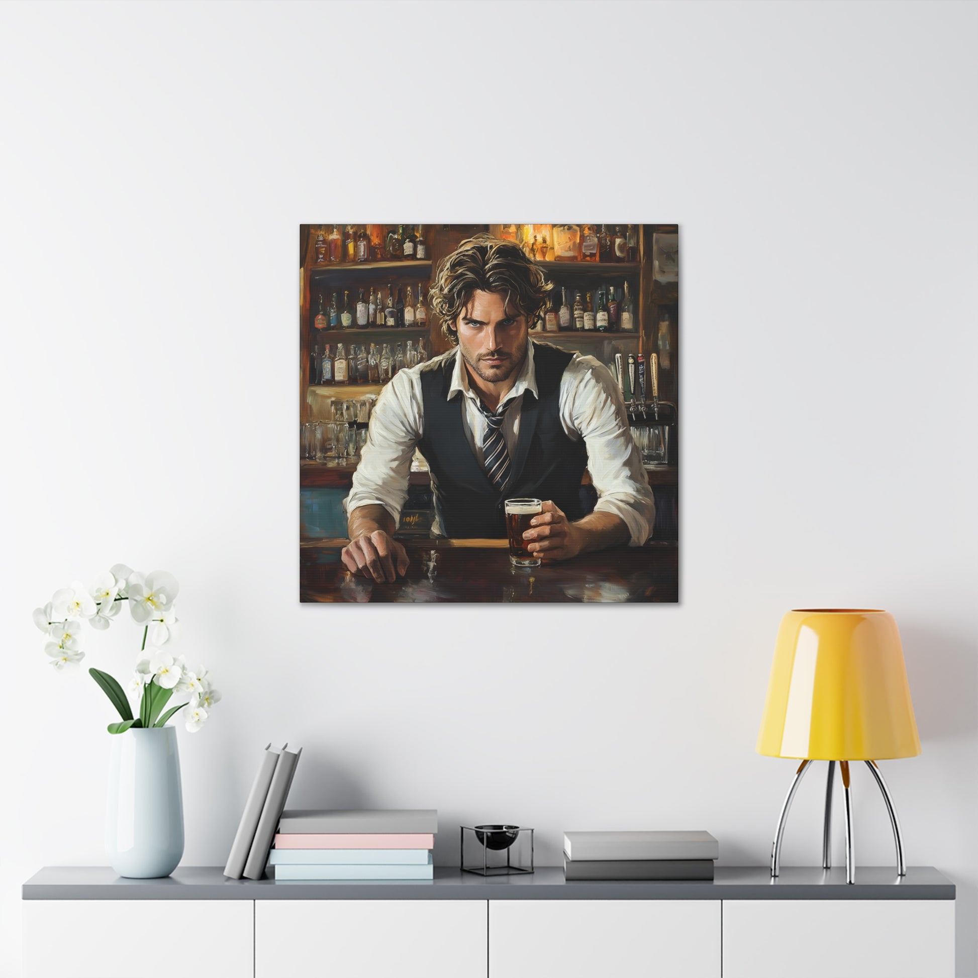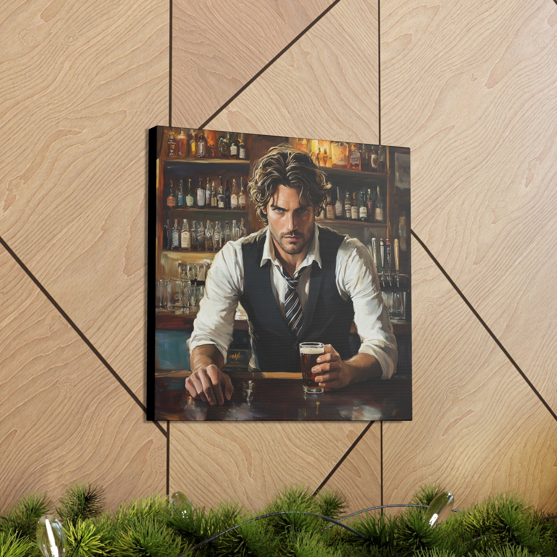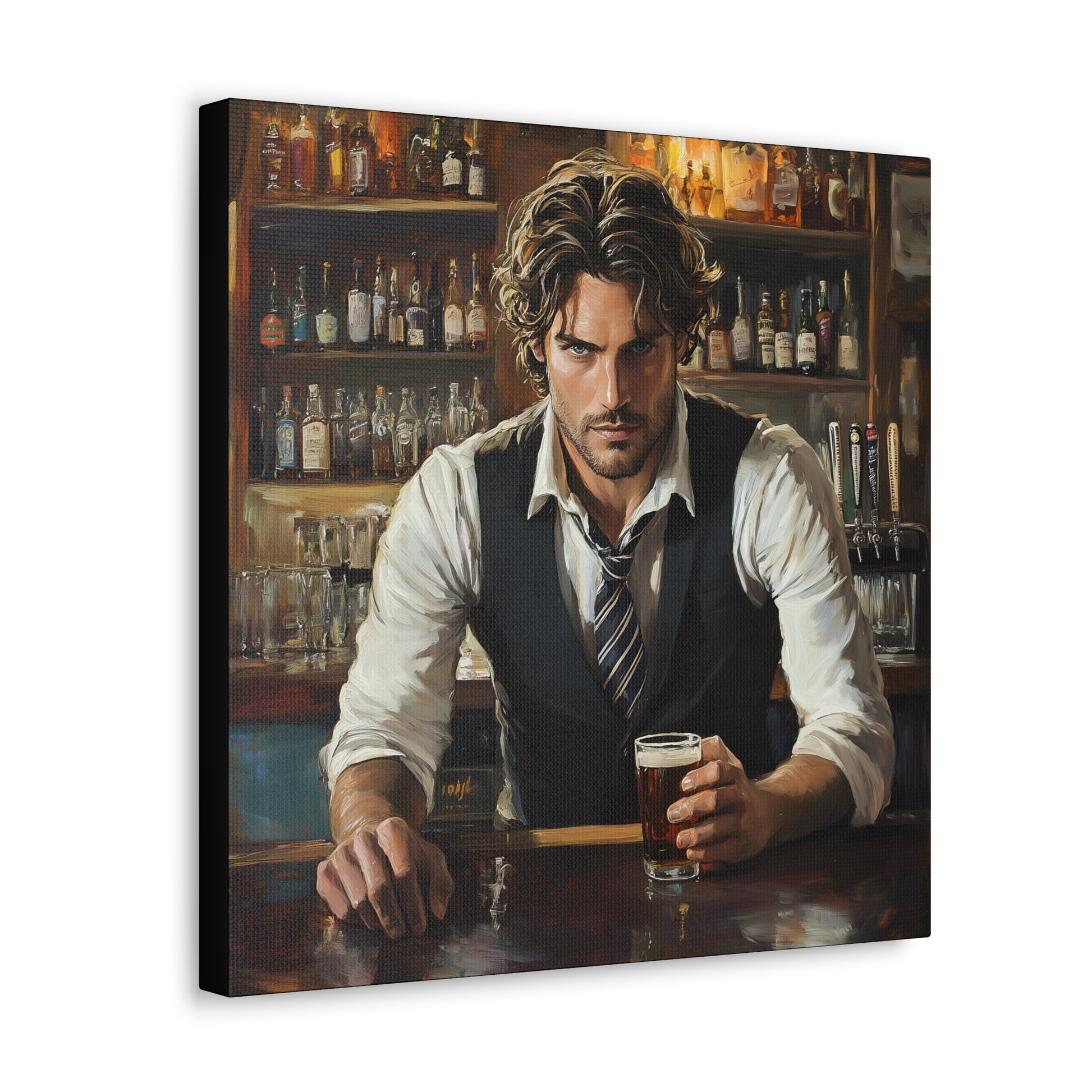Introduce a captivating focal point to your space with our striking canvas art, "The Bartender's Gaze." This powerful piece features a ruggedly handsome bartender, exuding intensity and confidence as he holds a glass of beer. The detailed portrayal against the backdrop of a well-stocked bar captures the essence of nightlife and the artistry of mixology, making it a must-have for any bar, lounge, or home decor.