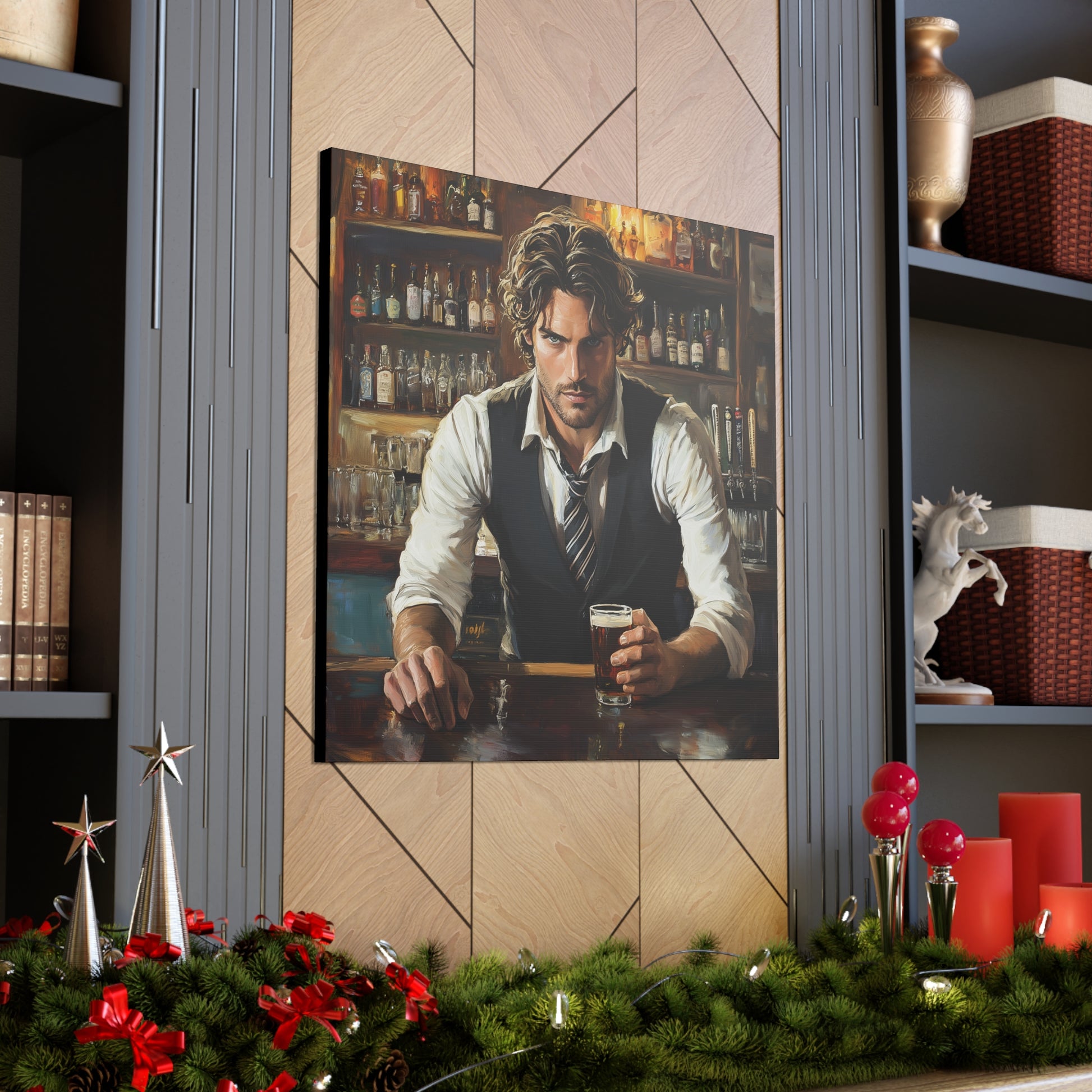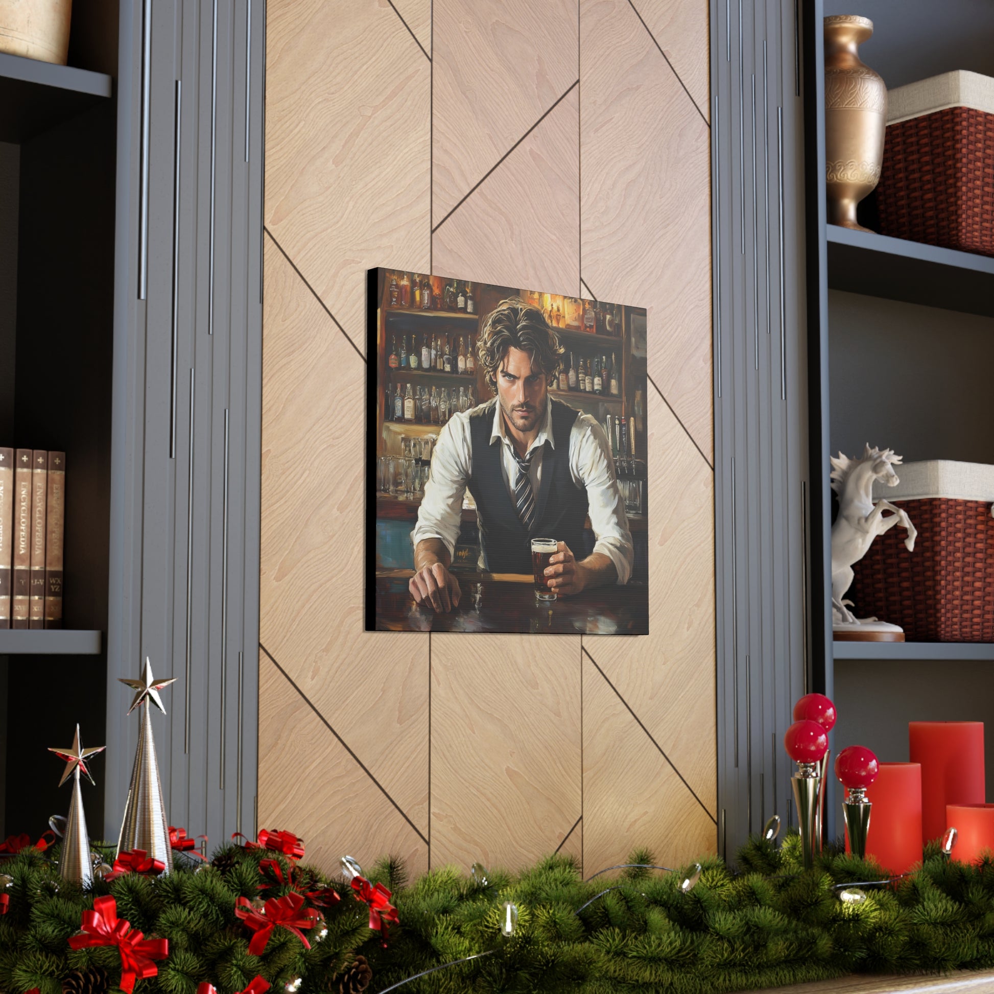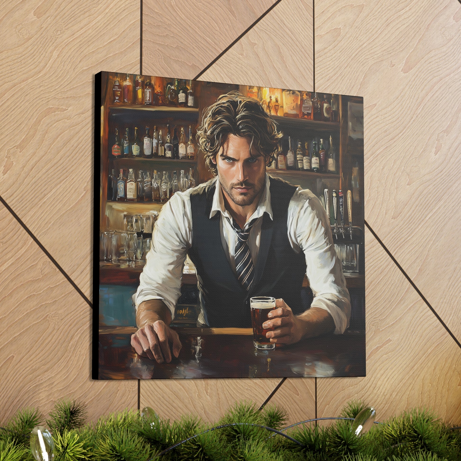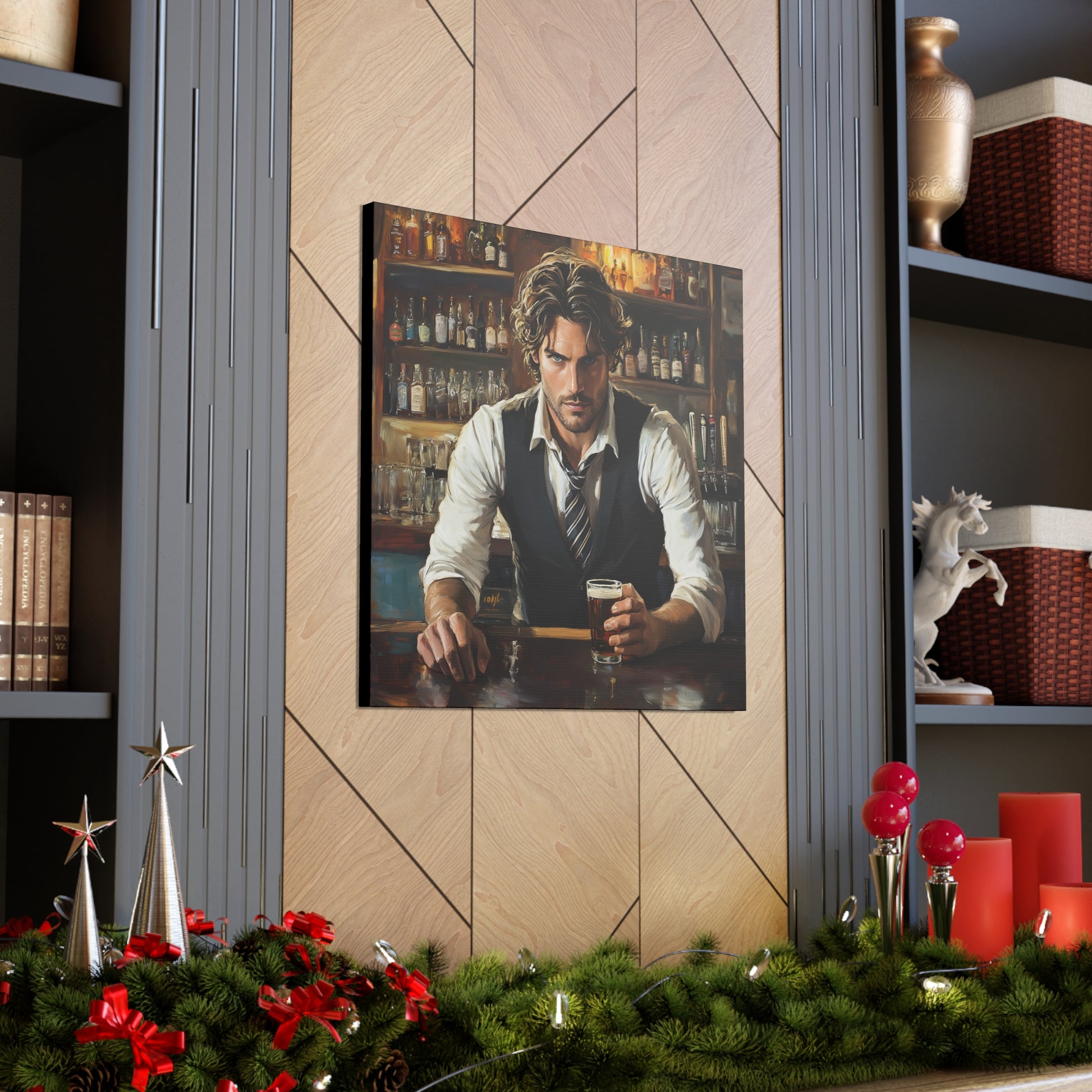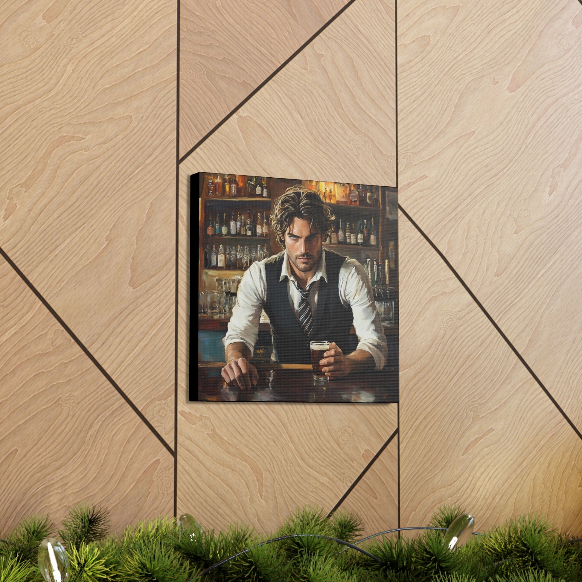 Introduce a captivating focal point to your space with our striking canvas art, "The Bartender's Gaze." This powerful piece features a ruggedly handsome bartender, exuding intensity and confidence as he holds a glass of beer. The detailed portrayal against the backdrop of a well-stocked bar captures the essence of nightlife and the artistry of mixology, making it a must-have for any bar, lounge, or home decor.