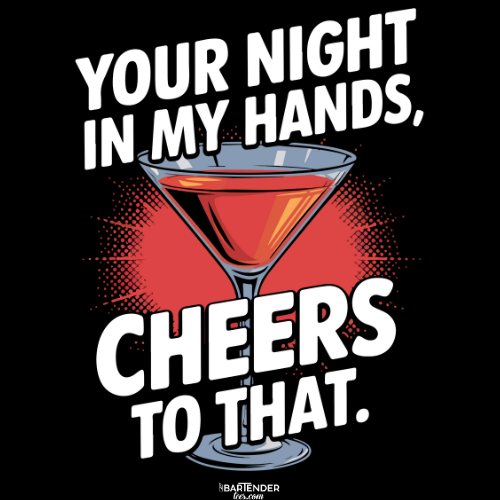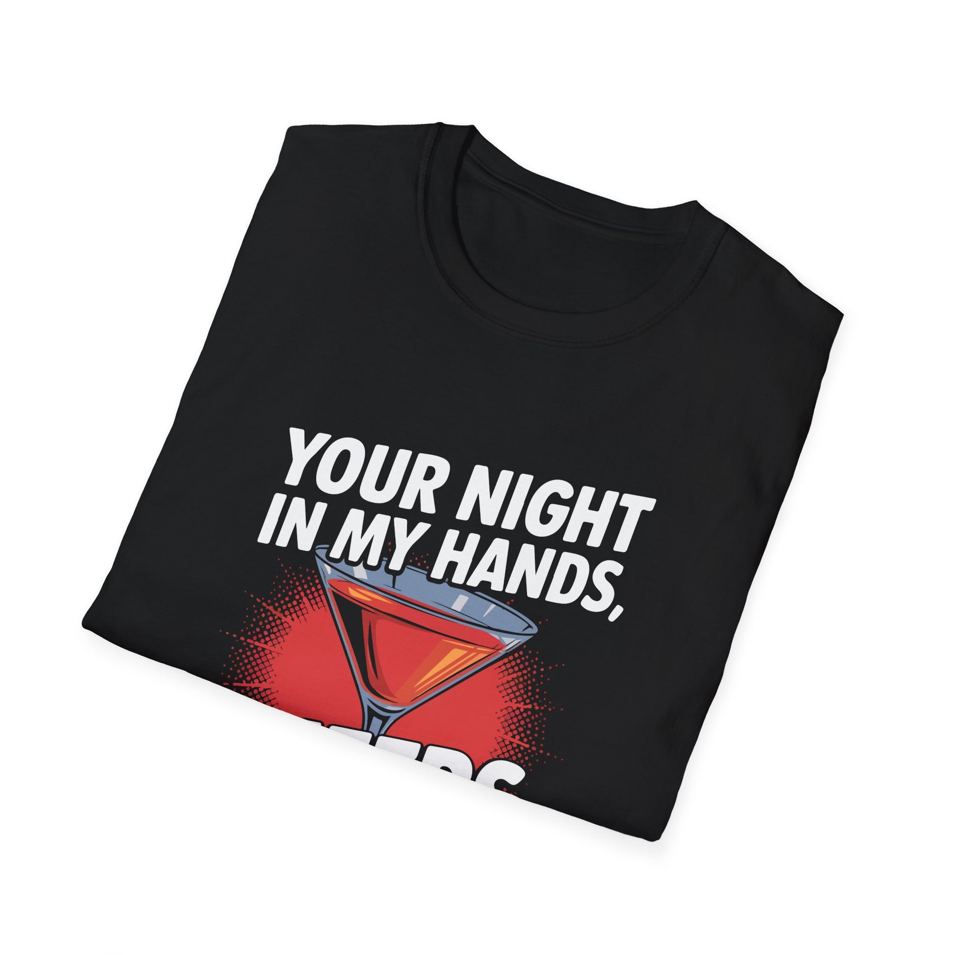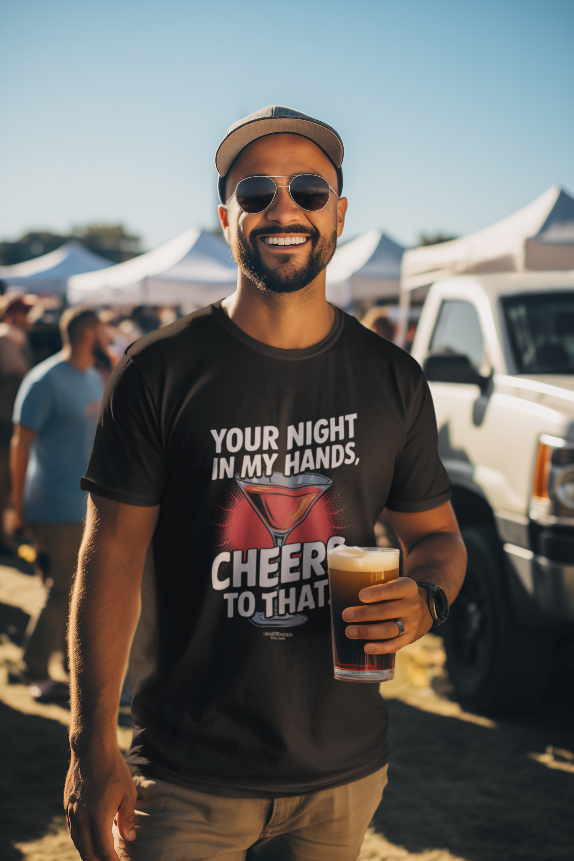 Celebrate your role in making nights unforgettable with the "Your Night in My Hands, Cheers to That" tee. Featuring a vibrant martini glass illustration and bold lettering, this shirt is perfect for bartenders who take pride in their craft. Whether you’re mixing up cocktails or pouring the perfect drink, this design adds flair to your bartending persona. Get ready to own the night—cheers to that!
